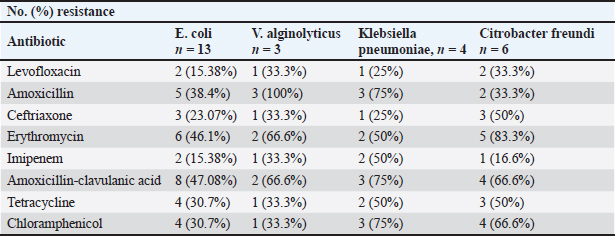 All identified isolates were tested for susceptibility to various antibiotics according to guidelines set by CLSI. The antibiotic sensitivity patterns of the gram-negative bacteria isolated from S. japonicus are summarized in Table 5. The antibiogram results of the tested isolates showed different resistance to eight types of antibiotics. The majority of isolates of E. coli were resistance to amoxicillin, amoxicillin-clavulanic acid, and erythromycin, but less resistant to other antibiotics. Similarly, higher resistance of V. alginolyticus has been reported against amoxicillin, amoxicillin-clavulanic acid, and erythromycin, whereas they have the same resistance to tetracycline, chloramphenicol, levofloxacin, ceftriaxone, and imipenem. Both K. pneumonia and C. freundii were resistant to all tested antibiotics Figure 4.