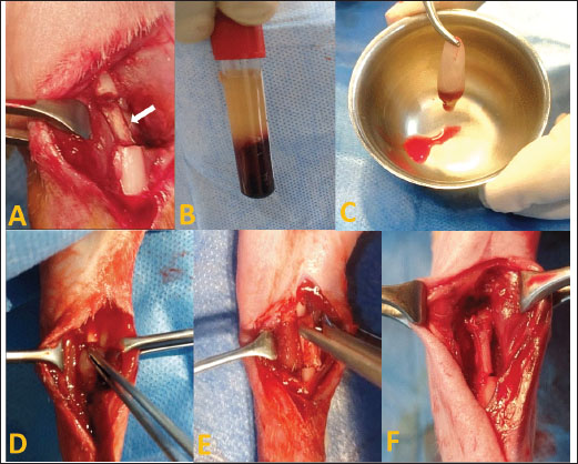 Fig. 1. Autogenous radius bone grafting in rabbits (A): Control group: the defect was left untreated. The white arrow indicates the ulnar bone. (B) and (C): Prepared fibrin clot of A-PRF+. (D): The defect was implanted in A-PRF+. (E) The defect was implanted with the third coccygeal vertebra. (F): The defect was implanted in the 11th rib. Surgical procedureThe rabbits were pre-anesthetized with 0.75 mg/kg of intramuscularly administered acepromazine maleate 1.5% (Castran, Interchemie CO., Netherlands) and a subcutaneous injection of xylazine 2% (Xyla, Interchemie CO., Netherlands) at a dose of 5 mg/kg. The induction of general anesthesia was performed with 35 mg/kg of 5% ketamine hydrochloride (Panpharma Laboratory, Fougères, France) administered intramuscularly (Boudra et al., 2020). The left forelimbs of rabbits were prepared for surgery by shaving and aseptically preparing the skin with 10% povidone-iodine. The animals were then positioned laterally on the operating table. Under general anesthesia, a 4 cm craniomedial surgical incision was made across the left forelimb. The muscles were dissected to expose the radius. A 10 mm segmental radius bone defect was created at the diaphyseal site of the bone, and the interosseous ligament was surgically severed, facilitating the removal of the bone segment. The treatment of radius bone defects was performed according to the designated group distribution, as shown in Figure 1. After filling the bone defect, the internal fixation of the radius was considered unnecessary because the ulna provided adequate support. The surgical incision was subsequently closed with 2/0 vicryl sutures for the muscle and subcutaneous layers and 2/0 braided silk sutures for the skin. Cefazolin sodium 1 g (Zinol, Pharco Pharmaceuticals, Alexandria, Egypt) was given intramuscularly for 5 days at a dosage of 20 mg/kg (Demirel and Aksakal, 2015). To alleviate postoperative pain, meloxicam 0.75% (Amriya Pharmaceutical Industries, Alexandria, Egypt) was administered at a dosage of 0.6 mg/kg subcutaneously for a duration of 3 days (Varga, 2014). The rabbits were monitored in a recovery room post-surgery until they regained consciousness. The surgical skin stitches were taken out 7 to 10 days after the operation. The rabbits were sacrificed at 6 and 12 weeks following the surgery. Radiography and computed tomography (CT) were used to assess the treated radius bone defects, along with histopathological evaluation including macroscopic and microscopic analyses. Radiography and CT scanA radiographic evaluation was conducted using an X-ray generator (Pox-300 BT, Toshiba, RotanodeTM, Japan) with exposure factors of 2.5 mAs, 40 kVp, and 50 mA. A mediolateral radiograph was acquired on the day of surgery, as well as at 6 and 12 weeks post-surgery. Two orthopedic specialists independently assessed the treated bone defect area using the Lane–Sandhu radiographic scoring criteria, as shown in Table 1 (Zhao et al., 2021). CT scans of repaired radius bone defects were performed at 6 and 12 weeks postoperatively using a GE Lightspeed VCT 64 CT system (WIPRO GE HEALTHCARE PVT. LTD., Karnataka, India) at 140 KV and 50 mA. The RadiAnt DICOM viewer (Medixant, Poznan, Poland) was used to visualize the reconstructed coronal and three-dimensional (3D) images. The treated bone defect site was scored by two blinded orthopedic experts using Cheung’s grading standards, as shown in Table 2 (Ibrahim et al., 2016). Histopathological evaluationEvaluations at the macroscopic level were conducted 6 and 12 weeks post-surgery. The soft tissue was removed from the left radius and ulnar bone. The bones were subsequently imaged and assessed by two specialists using the scoring system of 0 to +3 as defined by Parizi et al. (2013). A score of 0 signifies complete instability at the defect site, indicating nonunion. Scores of +1 and +2 were given when cartilage, soft tissue, or cracks were observed within the defect, suggesting a potentially unstable union. Bone bridging, signifying a complete union, was assigned a score of +3. Samples from repaired radius bone defects of rabbits were collected for microscopic examination at 6 and 12 weeks post-operations using a slow-speed saw. The samples were then fixed in a 10% buffered neutral formalin solution for 48 hours, decalcified for 3 weeks in a mixture of hydrochloric acid HCl 10% and formic acid 10%, dehydrated in an increasing ethanol gradient, cleared in xylene, and embedded in paraffin wax. Five micron-thick paraffin block sections were cut using a microtome (Leica RM 2155, England). The defect sites were subjected to longitudinal sections. Hematoxylin and eosin (H and E) and Masson’s trichrome were used to stain the specimens. Two separate histopathologists conducted the assessment process blindly, examining and analyzing all slides from all groups using Emery’s scoring system, as shown in Table 3 (Emery et al., 1994). Table 1. Lane–Sandhu radiographic scoring criteria.