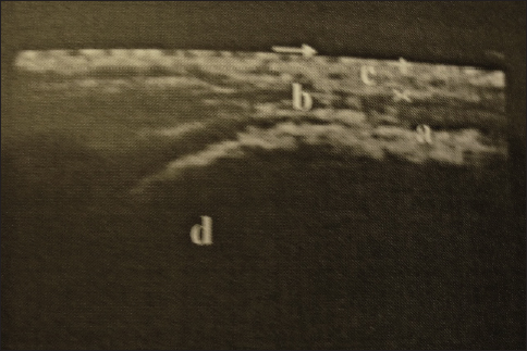 Fig. 3. Longitudinal ultrasongraphy at the sacro-iliac region (a-the dorsal sacroiliac ligament, b-longissimus dorsi tendon, c-gluteal fascia, and d- sacral tuber).