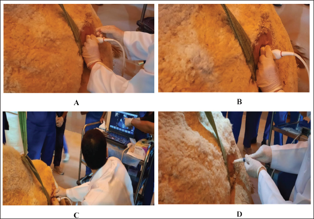 Fig. 1. Ultrasound-guided aspiration of abscess contents in the left kidney of camel number 14. (A). The needle was placed perpendicular to the transducer (B) and then inserted into the center of the abscess (C). Finally, the pus sample was collected (D).