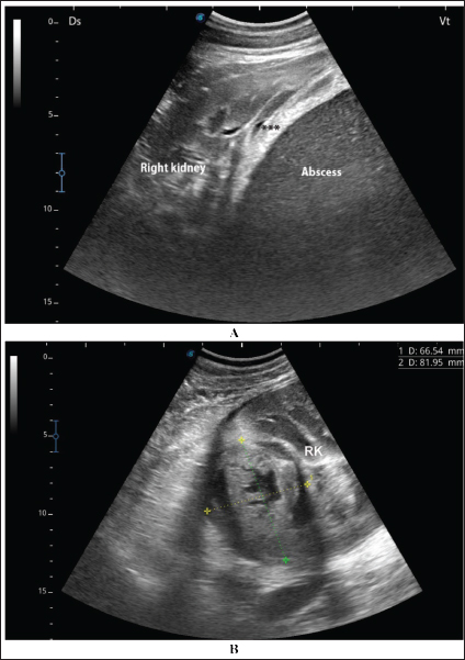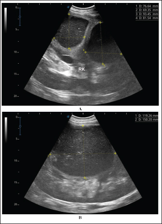 Fig. 4. Ultrasonographic findings of camel number 1 with abscessation of the right kidney. A large abscess was found in image A measuring 12.5 × 11.6 cm with hypoechoic contents and a thick capsule. The abscess in image B compresses the parenchyma of the right kidney (RK) and measuring 7.2 × 7.9 cm with echogenic contents and a thick capsule. A detailed description of the renal abscesses is presented in Figures 4–10. Figure 4 shows sonographic findings in camel number 1 with abscessation of the right and left kidneys. A large abscess measuring 12.5 × 11.6 cm with hypoechoic contents and a thick capsule was detected. A second abscess in the same camel was imaged compressing the parenchyma of the right kidney and measuring 7.2 × 7.9 cm with echogenic contents and a thick capsule. Figure 5 shows ultrasonographic results in camel numbers 2 and 4 with right kidney abscesses. The lesions in camel number 2 appeared markedly large, compressing the renal parenchyma, with echogenic contents and a thickened capsule. The lesion in camel number 4 appeared to compress the renal parenchyma of the right kidney, measuring 6.7 × 8.2 cm with echogenic contents and a thick capsule. In addition, Figure 6. clarifies sonographic findings in camel number 6, where the abscess appeared within the right kidney. The contents were heterogeneous, but the capsule could not be imaged. The urinary bladder in the same animal was imaged with echogenic deposits that appeared highly echogenic compared with the echogenic urine. Ultrasonographic findings in camel number 9 with right kidney abscesses are shown in Figure 7, where the lesion appeared compressing the parenchyma of the right kidney. Its contents are hyperechoic, and its capsule is thick. Figure 8 shows sonographic findings in camel number 11 with abscessation of the right and left kidneys. Abscesses measured 7.6 × 6.9 cm and 9.3 × 8.1 cm with isoechoic contents. A third abscess in the same camel was found within the left kidney. It was relatively large and was isoechoic. Ultrasonographic findings in camels 15 and 16 with abscesses of the left kidney are shown in Figure 9. A large abscess was found in camel number 15 with isoechoic contents and a thick capsule, while a small abscess was imaged in the left kidney of animal number 16 with heterogeneous contents. Figure 10 shows the ultrasonographic findings in camel number 17 with abscessation of the left kidney. A large abscess was found compressing the parenchyma of the left kidney with isoechoic contents. The urinary bladder in the same camel contained echogenic deposits that appeared to be highly echogenic.