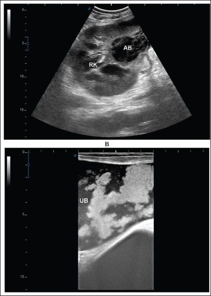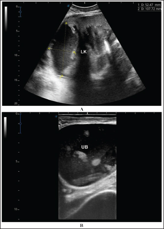 Fig. 6. Ultrasonographic findings in camel number 6. The lesion in image A appeared within the right kidney (RK). The contents are heterogenous, and the capsule is not evident. Image B shows the urinary bladder (UB) in the same animal with echogenic deposits that appeared highly echogenic compared with the echogenic urine. Bacteriological examination showed pure growth of a single type of colonies from all samples, which were Gram-positive cocci with grape-like clusters, catalase-positive (all samples), and coagulase-negative (12 samples). Results of biochemical identification by the Vitek 2 system revealed S. lugdunensis in 10 coagulase-negative isolates, S. aureus in 5 coagulase-positive isolates (probability of ≥ 98%), while 2 isolates (coagulase-negative) were unidentified. DiscussionPrevious studies by Tharwat et al. 2018b and 2018a reported signs like loss of appetite, body weight, and oliguria in camels with unilateral or bilateral kidney abscessation. In the current investigation, with the exception of 6 out of the 17 diseased camels that are presented with a history of bloody urine, remaining animals were presented with non-specific symptoms including general weakness, decrease or complete loss of appetite, emaciation, dry feces, dysuria, skin abscessation, bloody feces, and lameness. Four camels were also admitted with a history of abdominal pain. Therefore, camels with renal abscesses in the present study had various and diverse symptoms that did not indicate renal involvement, except in approximately one-third of the sick camels. Concerning hematological abnormalities, neutrophilic leukocytosis suggesting underlying bacterial infection was the only and most significant abnormality. Generally, studies in humans with renal abscessation reported that 80% of the patients had leukocytosis (Jiménez et al. 2022), and additionally, the total leukocytic count was significantly higher in those with renal and peri-renal abscesses (Lee et al. 2008; Tang and Cheong, 2017). In camels, severe neutrophilic leukocytosis was reported in two previously published 2 case reports (Tharwat et al. 2018a,b). Some of the tested biochemical metabolites differed significantly compared with the controls. Changes included hyperproteinemia, azotemia, hyperglycemia, and increased ALP serum activity. Increased serum protein concentrations, azotemia, and hyperglycemia were also found in 2 camels with renal abstention (Tharwat et al. 2018a,b). In cattle, Floeck (2007) observed azotemia in more than 50% of cows with pyelonephritis. Human studies have also reported hypoalbuminemia in patients with renal and perirenal abscesses and acute pyelonephritis (Lee et al. 2008; Lim and Ng, 2011). Interestingly, changes in creatinine concentration in the latter study and in our current investigation were non-significant compared with controls (Lee et al. 2008).