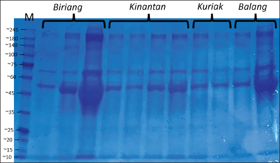 Fig. 1. SDS-PAGE profile of spermatozoa proteins in Kokok Balenggek roosters. Ethical approvalThe Faculty of Medicine, Universitas Andalas, Indonesia’s ethical clearance committee helped secure consent for the use of animals in research (Ethics no: 268/UN.16.2/KEP-FK/2024). ResultThe macroscopic characteristics of the semen of the four Kokok Balenggek (AKB) rooster phenotypes are presented in Table 1. The semen volume varied significantly across phenotypes (p < 0.05), with the highest volume observed in the Biriang phenotype (1.18 ± 0.72 ml), followed by Kinantan (0.99 ± 0.39 ml), Kuriak (0.40 ± 0.17 ml), and the lowest in Balang (0.22 ± 0.07 ml). All phenotypes had white-colored semen with a specific smell and a thick consistency, except for the Kuriak phenotype, which had a more fluid consistency. Microscopic examination of sperm characteristics is shown in Table 2. The highest sperm concentration was found in the Kinantan phenotype (1.66 ± 0.15 × 109/ml), followed by Biriang (1.61 ± 0.30 × 109/ml) and Balang (1.41 ± 0.11 × 109/ml), with the Kuriak phenotype having the lowest concentration (0.62 ± 0.14 × 109/ml) (p < 0.05). Sperm motility was highest in the Biriang, Balang, and Kinantan phenotypes (83%, 81%, and 82%, respectively), whereas the Kuriak phenotype exhibited significantly lower motility (64%) (p < 0.05). Viability percentages were similar across all phenotypes, with no significant differences (ranging from 91% to 93.66%) (p > 0.05). The percentages of abnormalities were lowest in the Biriang and Balang phenotypes (6.20% and 6.1%, respectively), whereas the Kinantan and Kuriak phenotypes had slightly higher abnormalities (8.46% and 7.20%, respectively) (p > 0.05). Plasma membrane integrity was highest in the Kinantan and Biriang phenotypes (79.60% and 79.20%, respectively), whereas the Kuriak phenotype had the lowest membrane integrity (67.40%) (p < 0.05). The protein concentration was highest in the Kinantan phenotype (2.23 ± 0.76 mg/ml), followed by Biriang (1.90 ± 0.54 mg/ml), Kuriak (1.69 ± 0.99 mg/ml), and Balang (0.81 ± 0.13 mg/ml) (p < 0.05). Protein profiles in both spermatozoa and seminal plasma from four Kokok Balenggek (AKB) rooster phenotypes were analyzed according to MW. As shown in Figure 1, sperm proteins with MWs of 10, 25–35, 35–45, 45–65, and 100 kDa were identified in all phenotypes (Kinantan, Biriang, Jalak, and Balang). These proteins were consistently present across the different phenotypes, indicating a common protein profile in AKB sperm. In seminal plasma, as presented in Figure 2, proteins with MWs of 10, 20–25, 25–35, 45, 65, 75, 140, and 180–245 kDa were detected in all phenotypes. Similar to sperm proteins, these seminal plasma proteins were found consistently across the Kinantan, Biriang, Jalak, and Balang phenotypes, further suggesting a shared protein profile among the different phenotypes. DiscussionThe semen characteristics of Kokok Balenggek chickens observed in this study were slightly different from those of previous research (Ananda et al., 2023, 2024; Jaswandi et al., 2023; Husmaini et al., 2024). Specifically, the sperm concentration was higher in our study, and the percentage of abnormalities was also higher. In contrast, the percentages of motility and viability were relatively similar. These differences can be attributed to variations in the methodology used or to potential differences in environmental conditions. Compared with Thai chickens, our results indicated a lower sperm concentration and slightly lower viability (Lewchalermvong et al., 2022). Despite these differences, sperm quality in the four Kokok Balenggek phenotypes studied remained within the reference range for chickens. Similar findings were reported by Shanmugam et al. (2012), whose research showed that the volume of adult chickens ranged from 0.36 ± 0.05 to 0.48 ± 0.06 ml, with a viability range of 91.21% ± 1.49% to 92.12% ± 1.90%, abnormality percentages from 5.58% ± 2.82% to 6.13% ± 2.76%, and intact plasma membrane percentages ranging from 87.54% ± 1.75% to 89.65% ± 1.60%.
