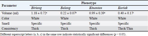 Table 2. Microscopic characteristics of Kokok Balenggek roosters semen across different phenotypes.