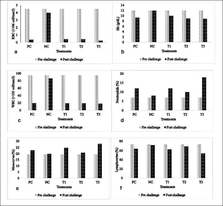 Nt=number of fish after the experiment. N0=number of fish at the start of the experiment. Data analysisThe hematological profiles and survival rates of the catfish were analyzed descriptively and compared to normal values. In addition, the density of E. tarda bacteria in various organs was analyzed using a one-way analysis of variance, followed by Duncan’s multiple range test when the significance level was set at p < 0.05. Ethical approvalThis study was conducted under the supervision and approval of the Faculty of Health, Medicine, and Natural Sciences at Airlangga University, with ethical clearance certificate number 85/UN3.1.16/2022. ResultsThe hematological profile of catfish following cohabitation with E. tarda-carrier exhibited alterations compared to pre-challenge assessments (Fig. 1), particularly within treatment group T3 (2:1 ratio) when compared to other treatments. The total red blood cell counts (Fig. 1a), Hb concentrations (Fig. 1b), and total white blood cell counts (Fig. 1c) demonstrated a decline after cohabitation. Conversely, the percentages of neutrophils (Fig. 1d), monocytes (Fig. 1e), and lymphocytes (Fig. 1f) increased after cohabitation compared with pre-challenge values. The hematological profiles of the NC group also exhibited changes although these were more stable than those observed in the other treatment groups. Bacterial counts in the liver, kidney, and spleen of silver rasbora showed E. tarda infection with bacterial densities ranging from 0.1 – 0.8 ×104 CFU/ml across all organs examined (Table 1). In the study, the density of bacteria in the liver, kidney, and spleen of post-cohabitation catfish with silver rasbora carriers was observed, as shown in Table 1. The highest bacterial density was observed in treatment T3 (2:1), whereas the lowest bacterial density was observed in treatment T1 (1:2) for all catfish organs. Catfish in all treatments, except the NC, exhibited 100% mortality by the 5th-day post-cohabitation (Fig. 2). Mortality began at 12 host infection (hpi) and increased exponentially starting at 72 hpi, reaching 100% at 120 hpi with E. tarda. DiscussionEdwardsiella tarda is a bacterial pathogen that causes Edwardsiellosis, which results in various alterations in hematological parameters and severe fish mortality. Edwardsiella tarda can adapt to many habitats and infect several hosts, resulting in significant mortality rates (Goh et al., 2023). Edwardsiellosis in fish causes several alterations in total RBCs, WBCs, Hb levels, and differential leucocyte counts (Tirani et al., 2024). Catfish hematological parameters and bacterial abundance changed significantly after cohabiting with silver rasbora carrying E. tarda. RBCs/erythrocytes, which are the most abundant blood cells in fish, play a vital role in the transportation of various substances (such as gases, water, minerals, nutrients, hormones, toxins, and metabolic waste products) within the body (Seibel et al., 2021). The decrease in the number of erythrocytes in catfish cohabitation with silver rasboras carrying E. tarda, particularly in treatment T3 (2:1), indicates that the catfish were affected by Edwardsiellosis. This finding is supported by the fact that the erythrocyte levels were significantly below the reference range of 3.02 ± 0.01 ×106 cells/mm3 (Fazio, 2019). Tjampakasari et al., (2024) reported that E. tarda secretes hemolysin toxins (EthA and EthB), which cause damage to the erythrocyte cell walls and result in cell lysis. Furthermore, Kalindamar et al. (2021) suggested that E. tarda hemolysin toxins facilitate adhesion and invasion within fish bodies, enabling intracellular bacterial survival. These findings are consistent with previous studies on tilapia (Sherif et al., 2021) and yellow catfish ( Pelteobagrus fulvidraco (Chen et al., 2020) infected with E. tarda. The decrease in erythrocyte count corresponds to a reduction in Hb levels in catfish following cohabitation with E. tarda carrier silver rasbora in all treatments (except for the NC), dropping below the normal Hb level of (12.423 ± 2.21 g/dl) (Al-Deghayem et al., 2017). This decline can be attributed to the positive correlation between the total erythrocyte count and Hb level, with pathogen infections inducing anemia (Ahmed et al., 2020). Edwardsiella tarda is believed to encode the fur (ferric uptake regulator) gene, which enables the bacteria to exploit iron from Hb released during erythrocyte lysis (Swain et al., 2020). Additionally, Lemos and Balado (2020) noted that E. tarda produces vibrioferrin, a compound similar to siderophore, which captures and extracts iron from heme-binding proteins in the host. Similar results were observed in yellow catfish (Pelteobagrus fulvidraco) (Chen et al., 2020) and Japanese flounder (Paralichthys olivaceus) (Sun et al., 2020) infected with E. tarda.