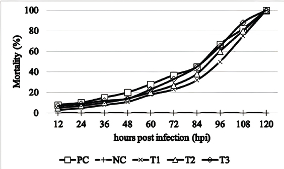 Fig. 2. Mortality graph of catfish (Clarias sp.) pre- and postcohabitation with E. tarda carrier silver rasbora (R. argyrotaenia) . PC: positive control; NC: negative control; E. tarda carrier silver rasbora cohabitate with catfish at ratios of 1:1 (T1); 1:2 (T2), and 2:1 (T3). WBCs/leukocytes play a crucial role in fish immunity and overall health. Increased leukocyte levels are positively associated with the release of cytokines, phagocytosis activity, and inflammatory responses against pathogens (Mokhtar et al., 2023). In this study, we observed that leukocyte counts in catfish decreased following infection with E. tarda in all treatment groups, except for the NC. These leukocyte levels fell below the reference range of 20–150 ×103 cells/mm3 (Yanuhar et al., 2021), resulting in mortality by day 5 postinfection. This suggests the failure of the immune system to effectively combat E. tarda infection, leading to disease and death (Firdaus-Nawi and Zamri-Saad, 2016). Similar findings were reported in goldfish (Carassius auratus) experiencing Edwardsiellosis, where death occurred on day 5 post-challenge, accompanied by an initial leukocyte increase on day 1 post-infection (dpi), followed by a decline by day 5 (Choe et al., 2017). Transcriptomic analysis of Japanese flounder (Paralichthys olivaceus) revealed 21 genes associated with E. tarda infection, leading to disease and death (Sun et al., 2020). Neutrophils, the first leukocytes to be activated at sites of infection, are responsible for pathogen neutralization through mechanisms such as the production of reactive oxygen species, neutrophil extracellular traps (NETs) (Buchmann, 2022), antimicrobial peptides, and proteolytic enzymes (Mokhtar et al., 2023). The percentage of neutrophils in catfish increased following cohabitation with E. tarda carrier silver rasbora in all treatment groups, especially in T3 (2:1). However, these values remained below the reference range for neutrophil levels in catfish, which is 26.2 ± 4.9% (Adamu and Solomon, 2015). This indicates that neutrophils were unable to effectively control E. tarda infection in catfish. This condition is suspected to be caused by premature activation of neutrophils, compromising their ability to engage in phagocytosis, NETs formation, and intracellular killing (Leliefeld et al., 2016). Boucontet et al. (2018) also suggested that a phenomenon known as neutrophil paralysis could further weaken the ability of neutrophils to neutralize invading pathogens in fish. Monocytes play a critical role in the immune system of fish by acting as phagocytes and serving various functions during infection, inflammation, and tissue repair (Yang et al., 2021). They are found in bone marrow, blood, and spleen and can differentiate into macrophages upon entering tissues. Observations of monocyte percentages in catfish after cohabitation with E. tarda carrier silver rasbora showed an increase in all treatments, particularly in T3 (2:1), compared with pre-challenge values. However, this increase did not provide benefits to the catfish because E. tarda can survive within monocytes and reduce their phagocytic capacity. Tjampakasari et al. (2024) reported that the type VI secretion system (T6SS) of E. tarda plays a crucial role in adhesion, penetration, and replication within fish phagocytes. Ma et al. (2024) also reported that the qseB and qseC genes contribute to the intracellular replication of E. tarda, leading to systemic infection in fish. Fish lymphocytes are generally similar to those in mammals, consisting of T and B cells that can express immunoglobulins (IgM, IgT, and IgD) (Sakai et al., 2021). Morphologically, fish lymphocytes are small, round cells with a thin, narrow rim of homogeneous basophilic cytoplasm surrounding a large, round, oval, or irregularly shaped nucleus (Witeska et al., 2022). The percentage of lymphocytes in catfish increased after cohabitation with the E. tarda carrier silver rasboras. However, this increase was still lower than the reference range for catfish lymphocytes (68%–76%) (Adamu and Solomon, 2015). The low lymphocyte percentage suggests that the catfish immune system failed to provide adequate protection against E. tarda infection. This condition is thought to result from immune suppression caused by the pathogen, leading to reduced cytokine production and decreased cytotoxic activity, particularly in T cells (Davoodzadeh Gholami et al., 2017) . Additionally, impaired B-cell maturation due to toxin activity from the pathogen hinders the production of immunoglobulins essential for defense against infections (Oakes et al., 2016). Bacterial examination demonstrated the presence of E. tarda in silver rasbora without causing mortality, indicating a robust immune system in these fish, preventing E. tarda from establishing and enhancing its virulence (Ben Hamed et al., 2018) . This is supported by the fact that silver rasbora are not susceptible hosts for E. tarda. Bujãn et al. (2018) noted that E. tarda infections are more prevalent in catfish, eels, flounders, and turbots. The presence of E. tarda in catfish organs suggests that the immune system, particularly phagocytic cells, was unable to eradicate the pathogen. Kupffer cells also known as macrophages, are found in the liver and play a crucial role in the early immune response to liver infection. They release proinflammatory cytokines and chemokines (Slevin et al., 2020; Hussein et al., 2023). Macrophages in the kidneys and spleens are organized into melanomacrophage centers (MMCs) that act as primary phagocytic cells (Bjãrgen and Koppang 2024). MMCs can also serve as biomarkers for environmental contamination (Marteja and Modina 2021). Edwardsiella tarda is an intracellular pathogen that can survive and coexist within macrophages. It enters cells through mechanisms such as macropinocytosis and endocytosis pathways involving cholesterol and dynamin compounds in the cell membrane (Hu et al., 2019). In phagocy