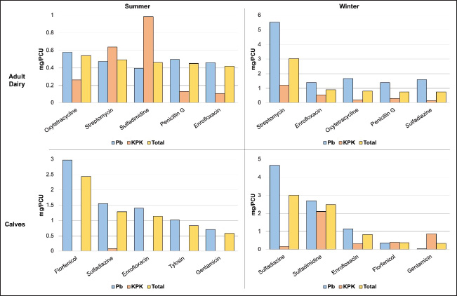 Fig. 2. Antimicrobials most used (mg/PCU) in adult dairy and calves during summer and winter. To the best of our knowledge, no other South Asian AMU study has covered such a large cohort and geographical area. The lack of an internationally accepted standardized AMU indicator makes data comparisons across species, production types, and countries difficult (Góchez et al., 2019; Umair et al., 2021a). This study used multiple AMU indicators for dairy cattle (kg, mg/PCU, and DDDA/1,000 cow-days). Multiple AMU indicators are valuable and provide more comprehensiveness and high-resolution AMU data. However, the use of different AMU metrics—such as weight-based measures (e.g., ACC and mg/PCU) and dose-based measures (e.g., DDDA per 1,000 animal-days) – may complicate comparisons of AMU data across regions and countries. These challenges arise because of variations in animal breeds, weights, and production systems across different geographical areas (Brault et al., 2019; Umair et al., 2021a). The newly published guidelines for farm-level AMU will help streamline and strengthen national-level AMU monitoring, and Pakistan can benefit from the guidelines for future monitoring activities (FAO and WOAH, 2023). This study calculated a lower AMU (26.34 DDDA/1,000 animal-days) in dairy cattle than the previously published study reporting 47.7 DDDA/1,000 animal-days from two commercial dairy cattle farms in Pakistan (Umair et al., 2020). Still, the value is comparable to a Brazilian study reporting 21.9 DDDA/1,000 animal-days (Tomazi and dos Santos, 2020). The variation in AMU levels between the two Pakistani studies may be attributed to differences in study duration, seasonal fluctuations, geographic regions, and the types of dairy farms involved, specifically small- to medium-scale farms versus large corporate commercial dairy farms. The higher treatment frequency observed in calves (36.71 DDDA/1,000 animal-days) was compared to dairy cattle (26.34 DDDA/1,000 animal-days) and may be attributed to suboptimal calf management and welfare practices, as well as an increased incidence of disease (Fentie et al., 2020; Ali et al., 2021). However, 26.34 DDDA/1,000 animal-days is much higher compared to AMU figures from developed countries, that is, 4.2 and 14.88 DDDA/1,000 animal-days reported from Pennsylvania and Wisconsin, United States, respectively (Pol and Ruegg, 2007; Redding et al., 2019), 16.05 DDDA/1,000 animal-days from the Netherlands (Kuipers et al., 2016), 20.78 DDDA/1,000 animal-days from Belgium (Stevens et al., 2016), and 8.87 DDDA/1,000 animal-days from the United Kingdom (Hyde et al., 2017). Table 3. Total AMU in calves divided into seasons (summer and winter) and provinces (Punjab and Khyber Pakhtunkhwa).