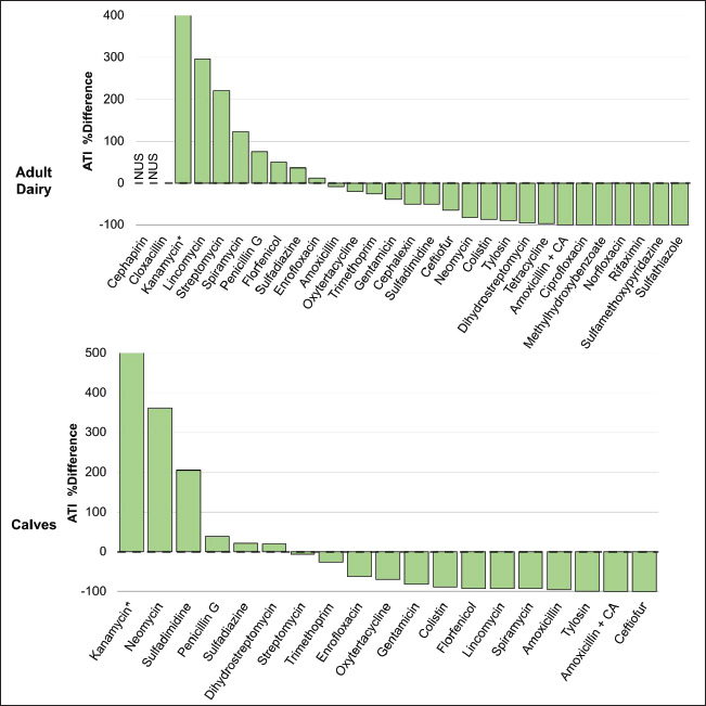 Fig. 3. Percentage difference in antimicrobial treatment incidence (ATI) in adult dairy cattle and calves during winter compared to summer. NUS=not used in summer. *Value exceeding graph limit–referred to Table 3. This could be due to poor management and husbandry practices and inadequate knowledge, attitudes, and practices of veterinary stakeholders (veterinarians, farm owners, farm managers, veterinary pharmacies, and pharmaceutical companies) in Pakistan regarding AMU and AMR. In addition, there was a decrease in cumulative AMU from summer to winter in both adult dairy cattle (29.80 to 22.68 DDDA/1,000 animal days) and calves (53.48 to 18.73 DDDA/1,000 animal days), which could be attributed to higher disease incidence in summer rather than winter, likely due to housing conditions (Sanders et al., 2009). Moreover, Saman and colleagues reported that the majority of antibiotics prescribed by veterinarians in Pakistan were CIAs, with a sizable proportion of CIA-HhP and CIA-HtP (Saman et al., 2023). Our findings showed that CIAs in food animals contained a considerable amount of CIA-HtP, with 17.35% in adult dairy cattle and 24.01% in calves. These findings are consistent with a recent study from Pakistan, which reported the country is importing large volumes of CIA-HtP for use in food animals (Umair et al., 2022), but contradict an earlier one (Umair et al., 2020).