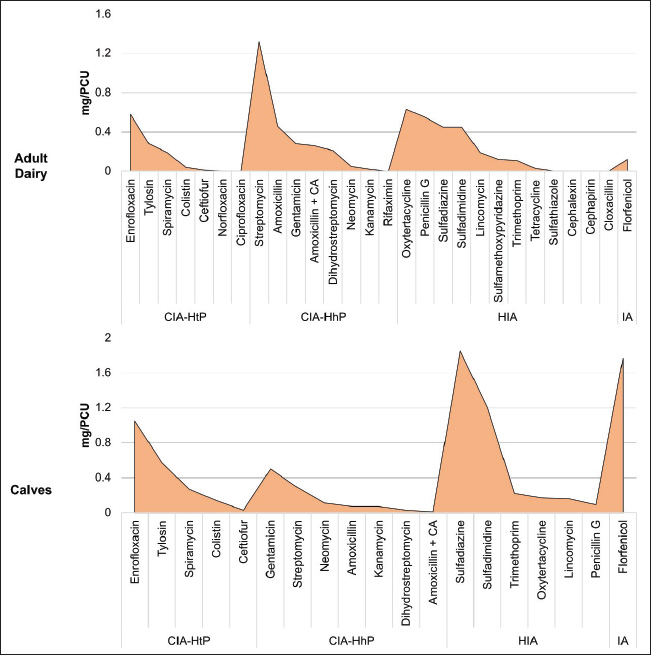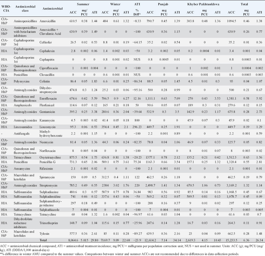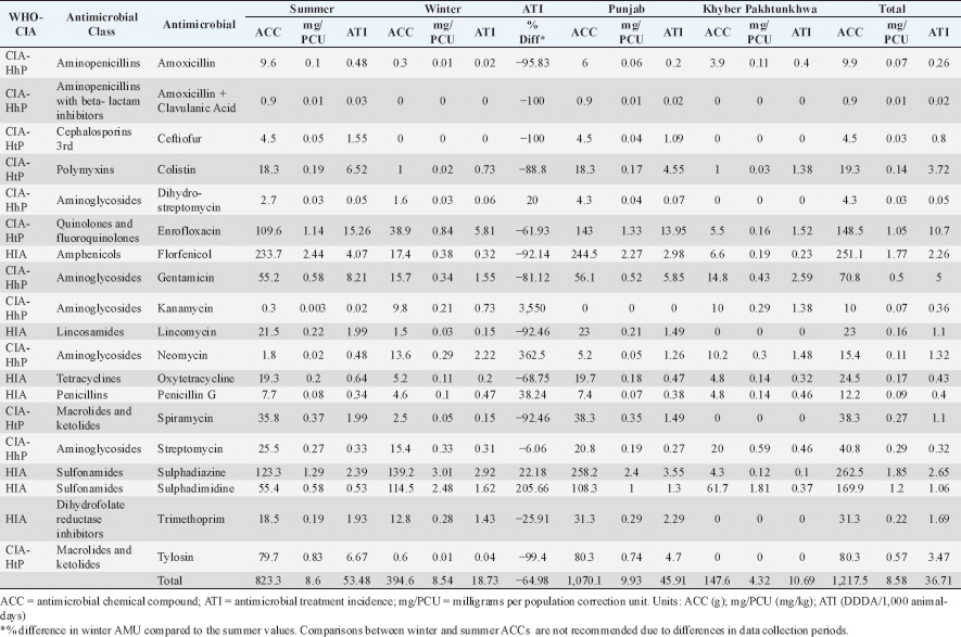 AMU seasonal variationsResults from our study indicated that total ATIs for both provinces in adult dairy cattle increased in winter for enrofloxacin, florfenicol, penicillin G, spiramycin, streptomycin, lincomycin, and kanamycin, that is, from 12% increase in enrofloxacin (5.59 in summer–6.27 in winter DDDA/1,000 animal-days) to 900% increase in kanamycin (0.02 in summer–0.18 in winter DDDA/1,000 animal-days). However, the overall ATI for all antimicrobials used for adult cattle in winter decreased by 23.9% from summer values, that is, from 29.8 in summer to 22.68 in winter DDDA/1,000 animal-days (Table 2, Fig. 3). In contrast, the overall ATI for all antimicrobials decreased by 65% in calves, that is, from 53.48 in summer to 18.73 in winter, DDDA/1,000 animal-days. However, the incidence of treatments increased sequentially for kanamycin (0.02–0.73 DDDA/1,000 animal-days), neomycin (0.48–2.22 DDDA/1,000 animal-days), sulphadimidine (0.53–1.62 DDDA/1,000 animal-days), penicillin G (0.34–0.47 DDDA/1,000 animal-days), sulphadiazine (2.39–2.92 DDDA/1,000 animal-days), and dihydrostreptomycin (0.05 to 0.06 DDDA/1,000 animal-days) (Table 3, Fig. 3). AMU classification by WHO-CIAIn adult dairy cattle, in terms of ACCs used per PCU (mg/PCU), 17.35% of the antimicrobials belonged to critically IA with the highest priority for human medicine (CIA-HtP), 40.9% belonged to high-priority antimicrobials (CIA-HhP), and 41.75% belonged to IA. CIA-HtP (37.44%) were the most frequently used antimicrobials in terms of ATI, followed by IA (32.96%) and CIA-HhP (29.59%) (Table 2, Fig. 4). In calves, in terms of ACCs weight IA (63.64%) was the most commonly used antimicrobial, followed by CIA-HtP (24.01%) and CIA-HhP (12.59). Among the ATI values, CIA-HtP (53.91%) was the most frequently used antimicrobial, followed by IA (26.12%) and CIA-HhP (19.97%) (Table 3, Fig. 4). DiscussionOne of the primary goals of the WHO’s GAP on AMR is to monitor AMU in food animal production systems (WHO, 2015). Implementing national- and farm-level AMU surveillance programs in many European Union countries has significantly reduced AMU in food animals (EMA, 2015). However, there are few national-level studies on AMU in food animals from LMICs (Cuong et al., 2018). Pakistan lacks formal AMU monitoring of food animals for various reasons, the most important of which is weak legislation and poor implementation of existing legislation. As such, this study provides quantitative AMU data in support of Pakistan’s ongoing national AMR surveillance efforts, and this is the first study to be conducted on a relatively large geographical area, that is, medium- to large-sized herds from two provinces in Pakistan.