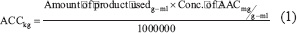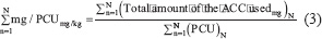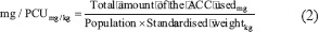 Milligrams of ACC per population correction unitThe total amount of ACC used in milligrams was divided by the population correction unit (PCU) for dairy cattle and calves to calculate the mg/PCU for dairy cattle and calves, respectively. The PCU was calculated by multiplying the total number of dairy cattle or calves by 425 or 140 kg, respectively (standardized average weight of dairy cattle and calves at the estimated time of treatment) (ESVAC, 2018) (Eqs. 2 and 3).