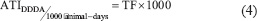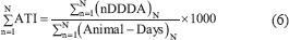 where animal-days is the product of the total number of animals at risk and the number of studied days. The cumulative ATI was calculated as follows: