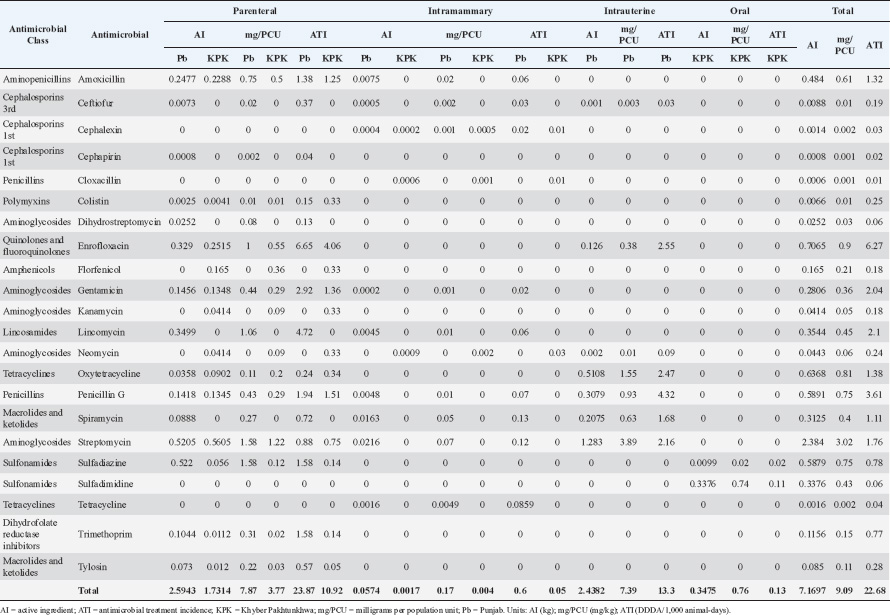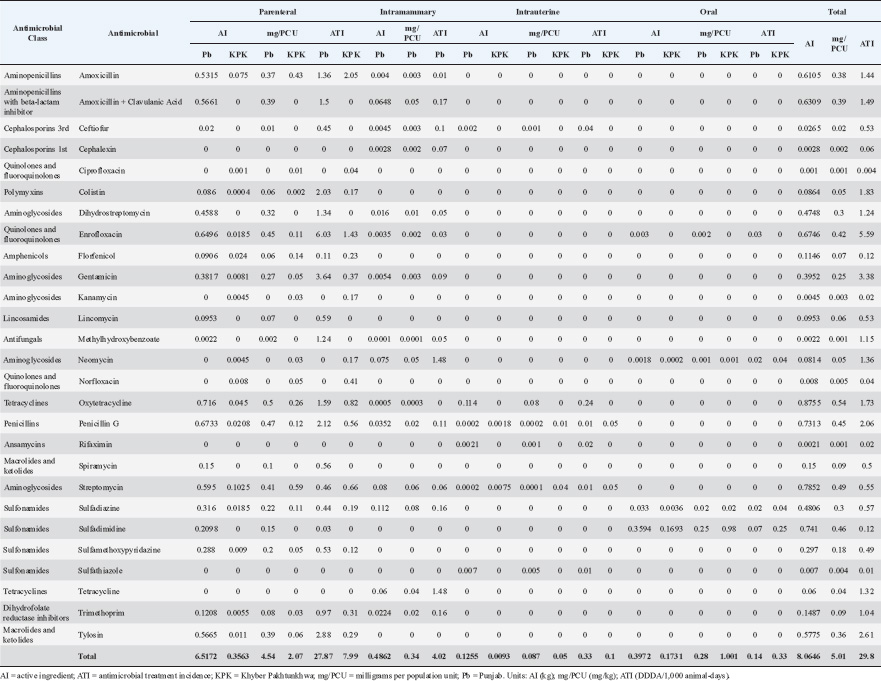 Calculations of WHO critically important antimicrobialsAll antimicrobial drugs used in adult dairy cattle and calves were categorized per the WHO list of critically important antimicrobials (IAs) for human medicine (WHO-CIA) (WHO, 2019). AMU percentages of WHO-CIA classes were calculated for the total ACCs used in adult dairy cattle and calves. Ethical approvalNot needed for this study. ResultsAMU data collectionDue to voluntary participation, for the summer phase, 10 out of 12 commercial dairy cattle farms completed the DCT treatment record. However, for the winter phase, PD-4 and PD-6 from Punjab and KD-3 and KD-4 from KP did not continue the survey and were replaced with PD-7 and PD-8 and KD-5 and KD-6, respectively. AMU of adult dairy cattleIn dairy cattle, 29 ACCs belonging to 15 antimicrobial classes were used at the surveyed farms in Punjab and KP during summer and winter. The cumulative AMU in adult cattle across both provinces for summer and winter was 15.23 kg, 6.36 mg/PCU, and 26.34 DDDA/1,000 animal-days. The total ACC weight of adult cattle in each province, during the time periods of study, was 12.61 kg in Punjab and 2.62 kg in KP. The total mg/PCU AMU for adult cattle in Punjab and KP in the studied time period was calculated to be 7.14 and 4.15, respectively. Streptomycin (3.17 mg/PCU), oxytetracycline (1.51 mg/PCU), enrofloxacin (1.38 mg/PCU), penicillin G (1.32 mg/PCU), and amoxicillin (1.09 mg/PCU) were the most heavily used antimicrobials per adult cow PCU in Punjab and KP in both seasons Table 2. The incidences of antimicrobial treatment for adult cattle in Punjab and KP across both seasons and all antimicrobials were 34.14 and 10.43 DDDA/1,000 animal-days, respectively. With all study treatments of adult cattle totalled, enrofloxacin (5.92 DDA/1,000 animal-days), penicillin G (2.81 DDA/1,000 animal-days), gentamicin (2.73 DDA/1,000 animal-days), oxytetracycline (1.56 DDA/1,000 animal-days), and tylosin (1.48 DDA/1,000 animal-days) were overall the most frequently used antimicrobials. Enrofloxacin, penicillin G, and gentamicin were shared antimicrobials among the most frequently used for adult cattle in Punjab and KP, with treatment incidences 7.09, 3.54, 3.5 DDDA/1,000 animal-days and 3.53, 1.32, and 1.17 DDDA/1,000 animal-days in Punjab and KP, respectively (Table 2, Fig. 2).