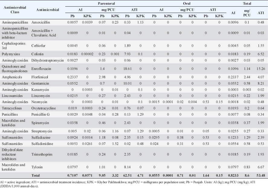 Fig. 1. Geographical locations of dairy farms in Punjab and Khyber Pakhtunkhwa participating in the AMU survey during the summer and winter months. Pb (Punjab); KPK (Khyber Pakhtunkhwa) In adult dairy cattle, antimicrobials were most frequently administered via the parenteral route, followed by intrauterine, intramammary, and oral routes. The AMU results for individual provinces and seasons classified according to the route of administration are given in Appendix S1 (Supplementary material). AMU in calvesIn calves, 19 ACCs belonging to 13 antimicrobial classes were used during the study period. Cumulative AMU values for calves across both provinces and seasons were 1.22 kg, 8.58 mg/PCU, and 36.71 DDDA/1,000 animal-days. In calves, cumulative ATI (36.71 DDDA/1,000 animal-days) was higher than in adult dairy cattle (26.34 DDDA/1,000 animal-days). The total ACC weight of calves in Punjab and KP across both seasons was 1.07 and 0.15 kg, respectively. Regarding mg/PCU, the total AMU for calves in Punjab and KP across both seasons was 9.93 and 4.32, respectively. The greatest weights of antimicrobials used per PCU of calf overall in both provinces and seasons were sulphadiazine (1.85 mg/PCU), florfenicol (1.77 mg/PCU), sulphadimidine (1.2 mg/PCU), enrofloxacin (1.05 mg/PCU), and tylosin (0.57 mg/PCU). The ATI total AMU for calves in Punjab and KP across both seasons was 45.91 and 10.69 DDDA/1,000 animal-days, respectively. In all study treatments of calves combined, enrofloxacin (10.7 DDDA/1,000 animal-days), gentamicin (5 DDDA/1,000 animal-days), colistin (3.72 DDDA/1,000 animal-days), tylosin (3.47 DDDA/1,000 animal-days), and sulphadiazine (2.65 DDDA/1,000 animal-days) were overall the most frequently used antimicrobials (Table 3, Fig. 2). In calves, antimicrobials were frequently administered via the parenteral route, followed by oral administration. Table 2. Total AMU in adult dairy cattle divided into seasons (summer and winter) and provinces (Punjab and Khyber Pakhtunkhwa).