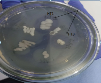 Fig. 2. Clear zones of isolates in selective cyanide (KCN) media. Table 1. Macroscopic identification of isolates.