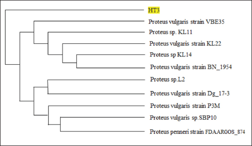 Fig. 6. Phylogenetic tree of HT3 isolates Morphological characteristics of cellulolytic and cyanolytic bacteriaIn the oxidase test, both isolates (HT1 and HT3) were oxidase-negative, indicating that they did not produce oxidase. In contrast, in the catalase test, isolates HT1 and HT3 tested negative and positive, respectively, as indicated by bubble formation upon the addition of hydrogen peroxide (H2O2). The catalase test determines whether bacterial isolates produce the enzyme catalase, which hydrolyzes hydrogen peroxide into water and oxygen. Catalase-positive results are characterized by the presence of bubbles after the addition of H2O2 (Roldan et al., 2021). In the motility test, both isolates obtained from cassava waste (HT1 and HT3) exhibited motility. Motile bacteria typically possess flagella that enable their movement (Ardiansyah et al., 2018). The microscopic observations of HT1 and HT3 are summarized in Table 2 and Figure 3. The results revealed that isolate HT1 is a long rod-shaped bacterium, whereas isolate HT3 is a shorter rod-shaped bacterium. In the Gram staining test, both isolates were classified as Gram-negative (-) bacteria, as indicated by the pink coloration. This characteristic results from bacteria possessing a thin peptidoglycan layer in their cell walls. Gram-negative bacteria have a cell wall structure composed of a thin peptidoglycan layer and high lipid content. Isolates HT1 and HT3 were identified as non-spore-forming bacteria because no clear areas indicative of spores were observed in the bacterial cells. This suggests that the isolates studied are not heat-resistant. Spore-forming bacteria can survive and protect themselves under extreme conditions such as heat, cold, and chemical exposure, as well as from parasitic bacteria. In contrast, spore-forming bacilli exhibit relatively high resistance to physical and chemical treatments (Cho and Myong 2020). Gene amplification and 16S rRNA sequence analysisThe electrophoresis results demonstrated that PCR amplified the 16S rRNA gene region of both isolates (HT1 and HT3). This was confirmed by the appearance of PCR products using the primers 27F (AGAGTTTGATCCTGGCTCAG) and 1492R (GTTTACCTTACGACT). The PCR bands exhibited a sufficiently high DNA concentration, allowing for clear visualization under a UV transilluminator Figure 4. These bands corresponded to PCR fragments, producing amplicons of 1498 bp (Fig. 4). The molecular approach aimed to analyze the phylogenetic relationships of the isolates by comparing ribosomal RNA sequences using 16S rRNA nucleotide sequence databases as references for the nucleotide sequences obtained from sequencing. According to the previous research (Prima et al., 2021), the amplification of the 16S rRNA gene utilizes a forward primer (specific to a given strain) designed based on a conserved region of the 16S rRNA gene that is genus-specific for bacteria. Table 5. Ability of Citrobacter freundii HT1 (HT1) and Proteus vulgaris HT3 (HT3) to improve cassava waste.