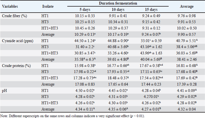 Open Vet. J.. 2025; 15(3): 1358-1369 Open Veterinary Journal, (2025), Vol. 15(3): 1358-1369 Research Article A novel bacterial approach to cassava waste fermentation: Reducing cyanide toxicity and improving quality to ensure livestock feed safetyHera Dwi Triani1,3, Ahadiyah Yuniza1*, Yetti Marlida1, Husmaini Husmaini1, Wulansih Dwi Astuti2 and Gusri Yanti31Departement of Feed and Nutrition, Faculty of Animal Husbandry, Andalas University, Padang, Indonesia 2Research Center for Applied Zoology, National Research and Innovation Agency (BRIN), Bogor, Indonesia 3Faculty of Science, Social and Education, Prima Nusantara Bukittinggi University, Bukittinggi, Indonesia *Corresponding Author: Ahadiyah Yuniza. Department of Feed and Nutrition, Faculty of Animal Husbandry, Andalas University, Padang, Indonesia. Email: yuniza [at] ansci.unand.ac.id Submitted: 22/12/2024 Accepted: 18/02/2025 Published: 31/03/2025 © 2025 Open Veterinary Journal