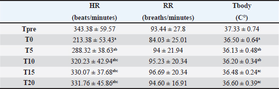 Table 3. Mean ± SD of physiological parameters. ap < 0.05 differences compared with Tpre. bp < 0.05 differences compared with T0. cp < 0.05 differences compared with T5.