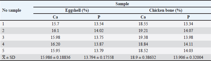 Fig. 2. Bar graph comparing Ca and P levels in synthesized HA from eggshells and chicken bones. Ca:P ratioThe Ca:P ratios of the eggshell and chicken bone samples were calculated and summarized in Table 2. The average Ca:P ratio of the eggshell samples was 1:1.158. 1:1.158, with individual ratios ranging from 1:1.145 to 1:1.167, indicating a relatively uniform distribution. The Ca:P ratio was higher in chicken bone samples, with an average of 1:1.359, with individual values ranging from 1:1.320 to 1:1.390. The higher Ca:P ratio in chicken bones suggests a higher Ca content relative to P than in eggshells. These differences in Ca:P ratios reflect the compositional variations between the two biological sources and may influence their performance in HA synthesis. DiscussionThe synthesis of HA from broiler chicken eggshells and chicken bone waste via calcination at 800°C demonstrated the feasibility of using these biomaterials as sustainable sources for HA production. Notably, chicken bone-derived HA had higher Ca and P content than eggshell-derived HA, which is consistent with our hypothesis. These findings underscore the potential of chicken bones as a more efficient raw material for HA synthesis, with promising applications in bone repair and regeneration in veterinary medicine. Furthermore, the comparison highlights the importance of selecting optimal raw materials to maximize HA yield and quality. The observed differences in Ca and P levels between eggshells and bones can be attributed to their distinct biological functions. Eggshells primarily serve as protective barriers and are rich in calcite, a crystalline form of calcium carbonate, whereas bones are composed predominantly of HA and other calcium phosphate-based minerals (Betancourt and Cree, 2017; Hahn et al., 2017). The compositional disparity is evident in the slightly higher Ca levels in bones, which are necessary for mechanical strength and structural integrity (Opris et al., 2020). Such levels are expected because 98% of Ca is stored in bones, whereas Ca and P are distributed to the eggshell only during production (Pelicia et al., 2009). In contrast, eggshells’ relatively lower Ca content may be due to their thinner and less mineralized structure than bone tissue (Kattimani and Lingamaneni, 2019). Compared with other studies, broiler chicken bone’s Ca and P levels are consistent with previously reported values for poultry bone-derived HA, reinforcing their suitability as raw materials (Kim et al., 2017; Li et al., 2020). However, the Ca levels in eggshells were slightly lower than those reported in other studies on calcium carbonate-rich materials (Brun et al., 2013; Bartter et al., 2018). This discrepancy may be due to regional variations in diet, genetics, or environmental factors influencing mineral deposition in broiler chickens from the Yogyakarta Special Territory. Table 2. Comparison of Ca and P ratio.