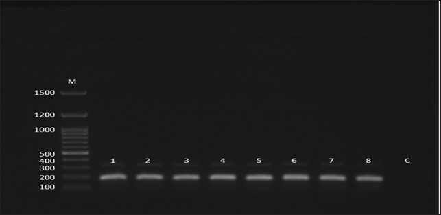 Fig. 2. Gel electrophoresis image (agarose 1.5 %) shows amplicons of CPIV-5 lanes 1–8 (size = 182 bp) by the conventional nested PCR. M: 100–1500 bp DNA molecular marker (Genedirex, South Korea); C is control negative in which similar PCR components were used except H2O was added instead of DNA.