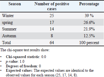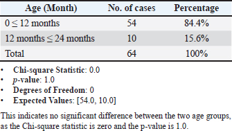 DiscussionThe results of the current study showed that the total infection rate of cat dermatophytosis was 47% (64 out of 136): Nweze (2011) also supported this high rate of prevalence in cats, and Esch and Peterson (2013) observed 58%–67% occurrence rate in their studies, (55.5%) (Murmu et al., 2015). In Kurdistan, Iraq, Jarjees and Issa (2022) discovered that M. canis was the most common isolate (95.24%) of dermatophytes from cats, with an isolated rate of 44.36%. One of the leading causes of dermatophyte infections in both humans and animals is the zoophilic dermatophyte Microsporum canis (Rad et al., 2018; Chupia et al., 2022). Other specialists believe that fungal skin infections in veterinary medicine are overdiagnosed (Moriello, 2004). Based on studies on the causes of skin diseases in cats using fungal cultures, the frequency of dermatophytes may be limited to all dermatological cases (Foil, 1990). Falahati et al. (2003) and Mattei et al. (2003) stated that M. canis is a dermatophyte that infects humans and animals by >60%. This study affirms that M. canis is the most frequent species of infection in cats and dogs, followed by M. gypseum and T. mentagrophytes (Bridhante et al., 2003) and Seker and Dogan (2011). Dermatophytosis infection was recognized to be more prominent in winter, with a prevalence of 39%, whereas it was less prominent in autumn, with a prevalence of 12.5%. These are statistically nonsignificant results at p < 0.05, as shown in Table 1. The chi-square statistic is zero, and the p-value is 1, indicating that there is no significant difference between the observed and expected distribution of cases across the seasons. Essentially, the prevalence of dermatophytosis does not vary significantly by season based on these data. The effect of season on the infection rate of dermatophytes was higher in winter and spring than in autumn. This could be related to the impact of the year season, climate, temperature, humidity, health of the cat, stress factors, number of spores, and hygiene on the prevalence of infection (Minnat and Khalf, 2019). Infection is significantly influenced by season. One factor that might increase the likelihood of dermatophyte infections is the wet winter months. Furthermore, weather variations significantly impact the cleanliness of cats’ bodies since owners refrain from walking their pets out of concern for diseases that might lead to skin infections or other abnormalities. The current results of the breed’s infection rates are in agreement with the previous study by Saleem et al. (2020), who found that a high prevalence of M. canis infestation was recorded in Persian cats, whereas the lowest prevalence of M. canis was recorded in the local breed (21.05%). Other researchers have found a higher prevalence in other breeds (Moriello and DeBoer, 1995; Cabañes et al., 1997; Puls et al., 2018). High infection rates were variable among different breeds because long-haired coat breeds trap more spores and have fungal-friendly environments than short-haired cats. Local breeds had the lowest prevalence because they are more immunologically competent than exotic breeds (Saleem et al., 2020). The effect of breed on this outcome may be explained by the aggressive behavior of males, which may cause injuries and abrasions of the skin, which is a predisposing factor to infections with dermatophytes (Frymus et al., 2013). However, the incidence of fungal skin infections in male and female cats did not differ significantly, according to research by Brilhante et al. (2003), Falahati et al. (2003), and Seker and Dogan (2011). Nonetheless, this result is consistent with a slightly greater prevalence of dermatophytoses in male cats, as Alpun and Ozgur (2009) described. In line with the findings of Falahati et al. (2003) (65.7% in males and 34.4% in females) and Ngwogu and Otokunefor, (2007) (29% in males and 1.4% in females), male patients were more affected than female patients. This may be because males are more likely to be associated with suffering pets. It is important that the rainy season has noticeably higher infection rates than other seasons because this corresponds with Falahati et al. (2003) and Maraki et al. (2012). According to the study, animals younger than one year were most impacted, which is consistent with other research (Minnat and Khalaf, 2019; Zaki et al., 2021). Moriello et al. (2017) reported that young animals are more vulnerable to dermatophytosis because of their immaturity, prior immunity, and skin microtrauma from ectoparasites or siblings. ConclusionAccording to the current study, fungal infections are most common in winter. M. canis is the main pathogen that infects vulnerable hosts of all ages. Therefore, taking appropriate precautions while caring for pets is important to reduce the risk of human infection. AcknowledgmentsSpecial thanks to the College of Veterinary Medicine, University of Fallujah. FundingNo funding. Author contributionMohammed Ali Hussein: Writing and editing. Khalid Ismael Oleiwi: practical work. Omar Attalla Fahad: sample collection. Conflict of interestThe authors declare no conflict of interest. Data availabilityData available upon request. ReferencesAasi, S.R. and Al-Aaraji, A.M. 2018. The inhibitory effect of Trichoderma harzianum CA-07 crude extract against Trichophyton mentagrophyte and Microsporium canis. Iraqi J. Sci. 1387–1395. Akpolat, N.O., Akdeniz, S., Elci, S., Atmaca, S. and Ozekinci, T. 2005. Tinea capitis in Diyarbakir, Turkey. Mycoses 48(1), 8–10. Ali, N.M. and Yassein, S.N. 2022. Isolation and identification of Microsporum Canis from pet animals of Baghdad Province. Proc. First Int. Conf. Adv. Res. Pure Appl. Sci. 2398, 1040044–1040048. Alpun, G. and Ozgur, N.Y. 2009. Mycological examination of Microsporum canis infection in suspected dermatophytosis of owned and ownerless cats and its asymptomatic carriage. J. Anim. Vet. Adv. 8(4), 803–806. Brilhante, R.S.N., Cavalcante, C.S.P., S