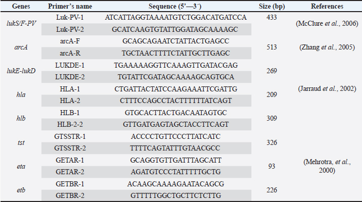 Staphylococcal cassette chromosome mec gene typing in MRSA isolates from healthy pet animals Multiplex PCR was used to amplify the SCCmec genes according to the method performed by (Zhang et al., 2005). A PCR mixture volume of 30 µl was used, and the details of the SCCmec primers (I, II, III, IVa, IVb, IVc, IVd, and V) are shown in (Table 1). Characterization of the virulence genes of MRSA isolates from pet animals Different virulence genes were selected to examine whether they were found in MRSA isolates or not. The following virulence genes were selected: Panton-valentine leukocidin (PVL), Arginine Catabolic Mobile Element (arcA), LukE-LukD leucocidin (lukE-lukD) gene, Alpha-hemolysin (hla), Beta-hemolysin (hlb), toxic shock syndrome toxin-1 (tst), accessory gene regulator (agr) genes, and exfoliative toxin A (eta) and exfoliative toxin B (etb) genes. A total volume of 20 µl PCR mixture was used, and each gene was amplified according to details described in Table 2. Antimicrobial susceptibility of MRSA isolates The confirmed MRSA isolates by PCR were selected to examine the susceptibly patterns of the 14 antimicrobial agents from different antimicrobial classes using the automated Vitek 2 Compact System. The isolates were categorized as susceptible, resistant, or intermediate according to the guidelines provided. ResultsNasal carriage of S. aureus in healthy pet animalsA total of 135 nasal swabs were collected from apparently healthy household pets, including 100 cats and 35 dogs. Samples were then subjected to phenotypic and molecular characterization. Furthermore, the isolates were screened to obtain an antibiotic resistance profile, and the samples were further processed for the phenotypic detection of MRSA phenotypically and also through the amplification of mecA gene among healthy animals. Of the 135 nasal swabs from both cats and dogs, 68 (50.4%) were tested positive by using standard bacteriological methods. Therefore, the rate was different among the 100 cats: 50 (50%) were positive and among the 35 cats, 18 (51.4%) were suspected. The amplification of the S. aureus species-specific nuc gene (226 bp) showed that of the 68 suspected isolates, 56 (82.4%) samples were confirmed as S. aureus. However, the recovery rate was different; S. aureus was detected in 41 of 50 cats and 15 of 18 dogs at rates of 82% and 83.3%, respectively (Table 3). Nasal carriage of MRSA in healthy petsThe nostrils of healthy pets were also examined to determine whether they carried MRSA isolates or not; the detection was performed through the amplification of mecA gene and phenotypically by antibiotic susceptibility test. The results showed the detection of MRSA in nostril isolates at a total rate of 23.2% (13/56) from both cats and dogs. The prevalence rate was different in cats and dogs and it was 22% (9/41) and 27% (4/15), respectively. Table 2. Details of primers that were used to examine different virulence genes among MRSA isolates.