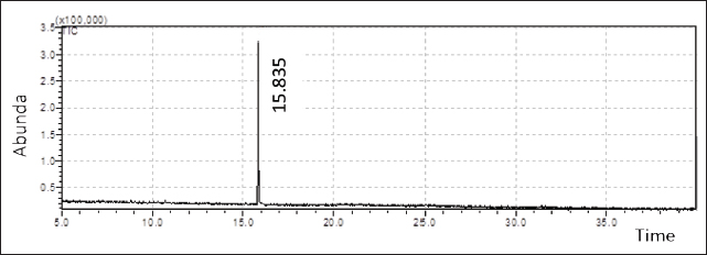 Fig. 1. Green tea China gas chromatography—mass spectrometry: The above figure shows a profile of the methanolic extract of green tea China. It is typical for caffeine, with a retention time of 15.835 and a concentration of 3.25 x 100.000. No other extracts were detected.