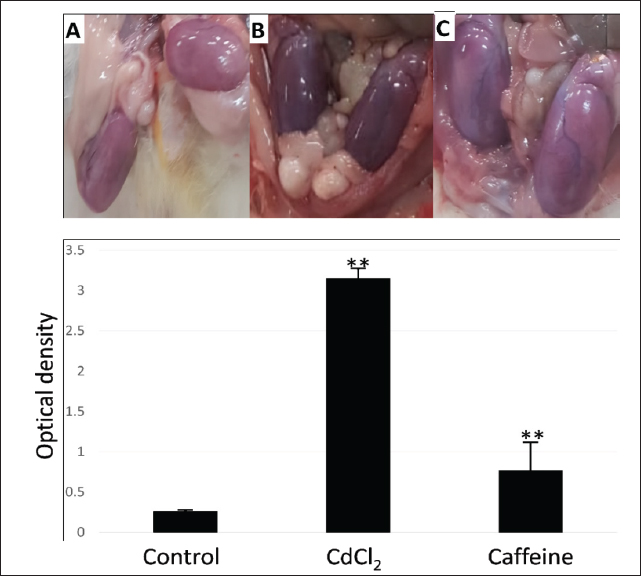 Fig. 2. Caffeine mitigating cadmium (Cd)-induced testicular damage: (A) control, (B) cadmium chloride (CdCl2), and (C) caffeine and CdCl2. This figure shows how caffeine treatment relieved Cd-induced damage. (B) shows congested and hemorrhagic testicles. When caffeine is included in the diet, there is clear protection against Cd-induced damage (D). Moreover, analysis of kidney tissue from CdCl2-treated mice revealed vacuolation and degeneration of kidney tubules (Fig. 5B). Nonetheless, receiving caffeine as part of the diet resulted in a mild improvement in pathological damage (Fig. 5C). To further investigate kidney health, the number of nuclei in sections from all groups was counted to determine whether Cd affects the number of viable cells in tissue. Unexpectedly, no significant differences were found between all treated groups; the counts of nuclei were comparable (Fig. 5).