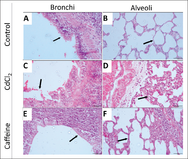Fig. 3. Caffeine extract reduces cadmium chloride (CdCl2)-induced tissue damage: Mice treated with CdCl2 showed sloughed bronchial epithelial linings and the thickening/congestion of alveolar septa (C, D). Caffein administration protected the bronchial epithelial lining and prevented congestion of the alveolar capillaries. However, the thickness of the alveolar septa did not change (E, F).