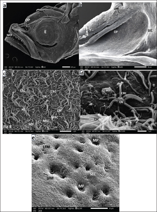 Fig. 2. a. SEM micrograph of the head of a seabass fry (35 days post-hatching) showing: Deepening olfactory pit (OP) above the mouth orifice (MO) and just anterior to the eyes (E) (Scale bar 200 µm). b. SEM micrograph of the deepening olfactory pit (OP) of a seabass fry (35 days post-hatching) Showing that it is bounded by SEC with labyrinthic microridges (LFMs) (Scale bar 50 µm).c. SEM micrograph of the olfactory pit (OP) bottom of seabass fry (35 days post-hatching) showing: Ciliated CRC, microvillous MRC both with their olfactory knob (OK) among ciliated CSCs with disarrayed long KC, mcrovillar MSC, and mucous cell pores (MP) (Scale bar 5 µm). d. Higher magnification SEM micrograph of the olfactory pit (OP) of seabass fry (35 days post-hatching) showing: CRC with short thick cilia emitted from the olfactory knob (OK), ciliated CSCs of long thin KC and mucus droplet (MD) (Scale bar 1 µm). e. Higher SEM micrograph at the periphery and around the olfactory pit (OP) of a sea bass fry (35 days post- hatching) showing: that this non-sensory area is packed with mucous cell pores (MP) among flattened SECs with their labyrinthic microridges (LFMs) (scale bar 10 µm). European seabass fingerlingsAt 90 days post-hatching, the European seabass fingerlings (3.5 cm) exhibited major developmental changes, with the formation of olfactory cavities (OCHs) and two nostrils. Seven OLs began to form olfactory rosettes (ORs). The left rosette was more developed and had a prominent lingual protrusion (LP; Fig. 4b), whereas the right rosette was less developed (Fig. 4c). The surrounding NSA was made of SECs with LFM and contained MP (Fig. 4d). The sensory area (SA) is populated by CSCs with KC and rare CRCs and MRCs (Fig. 4e, 4f). The NSA was primarily composed of GMCs and MPs interspersed between flattened SECs (Fig. 4g).