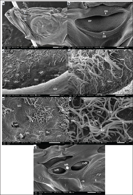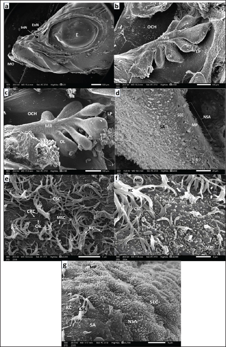 Fig. 3. a. SEM micrograph of a seabass head fry (45 days post-hatching) showing: More deepened olfactory pit (OP) in-between mouth opening (MO) and eye (E), with its medial upper and lower epidermal rim (ER) protruding inward, hanging over the olfactory pit to form the inter-nasal bridge (NB) (Scale bar 200 µm). b. SEM micrograph of the previous figure of seabass fry head (45 days post-hatching) showing: Elliptical deepening olfactory pit (OP) with medial upper and lower epidermal rims (ER) protruding inward hanging over the pit to form an inter-nasal bridge (NB) and then the roof of the olfactory chamber (OCH) (Scale bar 50 µm). c. SEM micrograph of a seabass fry olfactory pit bottom of 45 days post-hatching showing: Further deepening of the olfactory pit (OP) bottom and more elevation of its peripheries. The marginal nonsensory area (NSA) is partially enveloped within the disarrayed long thin KC of CSCs and the microvilli of MSCs. The olfactory pit is bounded by SECs of LFM embracing some MP of GMCs. But inward seldom detected CRCs with OK (Scale bar 10 µm). d. Magnified SEM micrograph of the previous peripheral area of the olfactory pit bottom 45 days post-hatching seabass fry showing: MSCs followed inward by CSCs with disarrayed long thin KC and seldom detected CRCs. The outer edge of the OP was covered with SECs and their LFM (Scale bar 2 µm). e. Magnified SEM micrograph of a seabass fry olfactory pit (45 days post-hatching) showing: Pit’s bottom periphery covered with SEC and LFM, separate islets of CSC with disarrayed long thin KC. Infrequently detected CRCs with their OK, some pores of GMCs and mucus droplets (MD) (Scale bar 5 µm). f. Higher magnification SEM micrograph of a seabass fry olfactory pit (45 days post-hatching) showing: Seldom noticed CRC and MRC were rarely observed with short thicker cilia and/or very short microvilli, respectively, radially emitted from OK dispersed among copious disarrayed long kinocilium of CSCs (Scale bar 1 µm). g. SEM micrograph of seabass fry head (75 days post-hatching) showing: Medially joining of the two medial upper and lower epidermal rims (ER) forming the inter nasal bridge (NB) separating the two nostrils, small anterior incurrent (InN), and considerably wider posterior excurrent (ExN) just anterior to the eye (E) (Scale bar 100 µm).