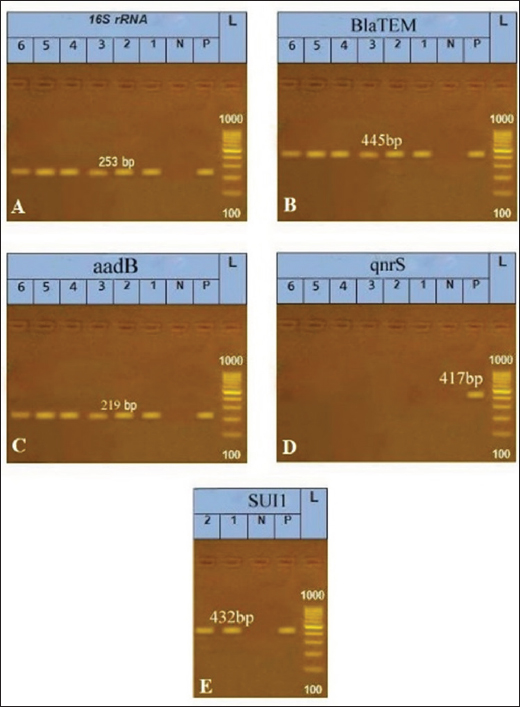 Fig. 1. Gel electrophoresis and PCR amplification for E. coli. Lane (L): DNA marker; lane (P): positive control; lane (N): negative control, (bp) base pair. (A): 1, 2, 3,4,5,6 lanes are positive for the 16S rRNA gene (253 bp). (B): 1, 2, 3,4,5,6 lanes are positive for the BlaTEM gene (445 bp). (C): 1, 2, 3,4,5,6 lanes are positive for aadB gene (219 bp). (D): 1, 2, 3,4,5,6 lanes are negative for qnrS gene (417bp). (E): 1 and 2 lanes are positive for Sul1 gene (432 bp). DiscussionBM is considered among the most common diseases in farm animals, resulting in a reduction in dairy milk consumption and high economic losses (Morales-Ubaldo et al., 2023). Escherichia coli is the major causative agent of clinical BM (Nery Garcia et al., 2024). In the environment, E. coli can invade the udders via the teat canal and cause intramammary infection (Burvenich et al., 2003). In the present study, out of the 80 examined BM animals, there were 50 positive samples for E. coli (62.5%) lower results were obtained by Hameed et al. (2008), Ali et al. (2011), Bhanot et al. (2012), Lamey et al. (2013), who observed E. coli at 15.38%, 16.18%, 16.3%, and 18.47%, respectively, in BM animals. The variations between the results of different reports may be due to the sample size, geographical distribution, management practice, and sanitary measures (Barua et al., 2014). Table 4. MIC of marbofloxacin and LF.