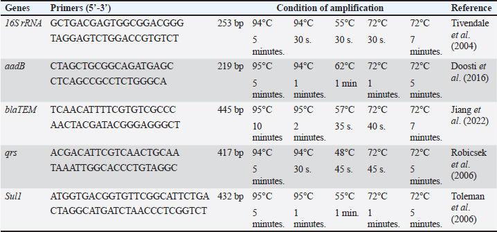 AbstractBackground: Bovine mastitis (BM) is a costly disease in the dairy industry. It is associated with reduced milk production and changes in milk composition and quality. Escherichia coli is the most important pathogen causing BM. Aim: This study aimed to assess the efficacy of lactoferrin (LF) as an enhanced agent when combined with marbofloxacin for the treatment of E. coli BM. Methods: Eighty lactating cattle and buffaloes, 40 each, aged 4–6 years suffering from BM underwent clinical examination. Milk samples were collected for bacteriological examination. The recovered E. coli isolates were subjected to serological, and polymerase chain reaction (PCR) analysis. BM cases were allocated into two groups: group (A) was treated with marbofloxacin combined with LF, and group (B) was treated with marbofloxacin alone. Results: Fifty E. coli isolates were recovered. Six serogroup were identified: O55, O103, O26, O11, O44, and O124. All isolates were sensitive to marbofloxacin, while there was resistance to gentamycin and ampicillin (26% each), cefquinome (14%), cefixime (10%), and SuLFamethoxazole and trimethoprim (4%). The molecular identification of E. coli strains revealed that the 16S rRNA gene was present in all identified E. coli strains (100%). All isolates resistant to antibiotics encoded BlaTEM, aadB, and Sul1, whereas the qnrS gene was not detected in any E. coli isolate. The broth dilution method did not detect growth when the marbofloxacin (6 µg/ml) was combined with LF (2 mg/ml). Group (A) showed significant improvements compared with group (B), with no recurrence rate. Conclusion: LF can serve as a significant cotreatment agent for treating BM. As antibiotic resistance increases, LF-based drugs could play an important role in providing sustainable, effective alternatives for dairy animals. Keywords: Bovine mastitis, Lactoferrin, E. coli, Marbofloxacin. IntroductionBovine mastitis (BM) is a mammary gland inflammation caused by physical trauma or bacterial invasion. It is the most prevalent and economically significant infectious disease in dairy farms worldwide (Sharun et al., 2021). Escherichia coli is the most prevalent Gram-negative pathogen causing clinical mastitis in dairy animals (Gao et al., 2017). Coliform mastitis causes high morbidity, and only 30%–50% of animals can regain their full production (Kutila et al., 2004) despite supportive and antibacterial therapy (Singh et al., 2024). Management of BM is challenging because it is polygenic. Antibiotics are considered the cornerstone of treatment for BM. The efficiency of treating animals with clinical mastitis depends on the use of appropriate antimicrobials that eradicate pathogenic bacteria from udder tissue. Broad-spectrum antimicrobial drugs, namely, 3rd generation cephalosporins and fluoroquinolones, are prescribed for treating coliform BM. These drugs can be administered via intramammary, intramuscular, or direct intravenous injections (Abd-ELFatah et al., 2024). Although antimicrobial therapy is associated with rapid bacterial elimination and a high rate of survival in animals, it can be a significant cause for spreading antibiotic-resistant bacteria to humans (Fatemi et al., 2024). The search for noninvasive therapeutic options that do not produce resistance is mandatory (Marques-Bastos et al., 2023). Some alternatives, such as peptides, glycoproteins, and nanoparticles, have been used and proven effective (Saeed et al., 2023). Lactoferrin (LF) is a glycoprotein naturally produced by polymorphonuclear neutrophils and epithelial cells. The protein is secreted by these cells at high levels in response to the inflammatory process. It has both bacteriostatic and bactericidal effects against a wide range of pathogens (Le et al., 2024). The function of LF in mammary gland immunity is to modify and regulate macrophage, lymphocyte, and neutrophil function in response to nonspecific resistance to infection. LF increases the permeability of bacterial cell membranes and destroys the outer membrane of Gram-negative pathogens by binding to its lipopolysaccharide (LPS) and inhibiting its damaging effects. Low LF levels in clinical BM may be inadequate for preventing bacterial proliferation in the udder tissue (Yassin and Abd Elhady, 2023). LF combined with antibiotics has a synergistic effect against BM. With an optimum dosage and duration of therapy, LF can help bacterial clearance from the animal mammary gland while simultaneously inhibiting the toxic properties of LPS (Diarra et al., 2002c). The objective of the current study was to assess the efficacy of LF as an enhanced agent when combined with marbofloxacin for the reduction of bacterial resistance to this antibiotic in E. coli BM. Material and MethodsStudy sampleThis study included 80 lactating cattle and buffaloes (40 each) from dairy farms aged 4–6 years. All animals had clinical mastitis. The study was conducted from January 2022 to October 2024 at the El-Beheira Governorate, Egypt. Clinical examination of animalsClinical examination of animals was conducted following Constable et al. (2016) to identify the clinical features of mastitis. California mastitis test (CMT)Equal volumes of CMT reagent and milk (2 ml from each quarter) were mixed thoroughly in a cup and then gently rotated for 10 seconds. The results were recorded and categorized into score 0 (negative), score 1 (trace), 2 (weakly positive), 3 (positive), and 4 (strongly positive) (Moroni et al., 2006). Collection of milk samplesMilk samples were collected for bacteriological examination after cleaning and disinfecting the animal teats with soap, water, and alcohol (70%) (Kerro Dego and Tareke, 2003). The first jet of milk from each quarter of the udder was discarded. Then, 5–10 ml was taken in a sterile vial. The samples were labeled with the identification number of the affected animal and the date of collection. The samples were then brought to the Animal Health Research Institute Laborator