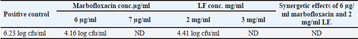 Buffaloes possess certain traits that can increase the risk of mastitis. Their udder is more pendulous than that of cattle (Moroni et al., 2006). In this study, 30 E. coli strains were isolated from buffaloes and 20 E. coli strains were isolated from cattle. In the current study, six serogroups were identified: O55 and O103 (20% each), followed by O26 (18%), and the least was O124 (12%). These results are similar to those obtained by Mohamed et al. (2011) showed that the most prevalent E. coli serogroup from persistent BM cases were O55 (19.2%), O119 (12.3%), O114 (10.5%), O26 (7%), O111 (15.8%), O124 (12.3%), O157 (7%), and O44 (3.5%). Antibiotics are considered the first-choice treatment for BM (El-Sayed and Kamel, 2021). The antibiotic sensitivity test is widely used in clinical investigations to determine the most effective antimicrobial drug for therapy (Singh et al., 2018). The antibiotic sensitivity testing of 50 E. coli isolates revealed that all isolates were sensitive to marbofloxacin. The isolates showed resistance to gentamicin and ampicillin (26% each), cefquinome (14%), cefixime (10%), and sulfamethoxazole and trimethoprim (4%). This finding agrees with Rahimiyan et al. (2021) w, who recommended the use of marbofloxacin as an effective drug in the treatment of East coli bone marrow infections. Fairbrother et al. (2015) and Martínez-Vázquez et al. (2018) concluded that 20% of the isolates were resistant to more than two groups of antibiotics and 20%–33% of E. coli isolates from BM cases were resistant to at least one drug. Yu et al. (2020) reported that all the isolated E. coli strains expressed multi-resistance to antimicrobial agents. The abuse of antibiotics leads to antibiotic resistance in pathogenic strains. These resistances are coded by specific genes that may be located on the bacterial chromosome, plasmids, transposons, or gene cassettes that bind to integrons; thus, they are easily transmitted through isolates (Daka et al., 2012). In this study, the molecular identification of antibiotic-resistance genes of E. coli strains revealed that all beta-lactam-resistant isolates possessed the BlaTEM gene. All sulfonamide-resistant isolates encode Sul1. All aminoglycoside-resistant isolates carried the aadB gene. The qnrS gene was not detected in any E. coli isolates. Similarly, Pishtiwan and Khadija (2019) detected blaTEM in 81% of E. coli isolates. Arabi et al. (2015) also detected Sul1 in 81% of E. coli isolates. In contrast, Yu et al. (2008) detected the qnrS gene in 14 (6%) E. coli isolates. Previous in vitro mastitis studies revealed that LF had an antibacterial effect against some principal udder pathogens, especially E. coli (Kutila et al., 2003), and it can prevent sequelae related to the use of antimicrobial drugs (Jenssen and Hancock, 2009; Yen et al., 2011). In this study, we detected the antibacterial activity of LF as a cotreatment with marbofloxacin using the broth dilution method, which revealed that the MIC of marbofloxacin was 6 µg/ml with a bacterial count of 4.16 log cfu/ml and MBC was 7 µg/ml, while the MIC of LF was 2 mg/ml with a bacterial count of 4.41 log cfu/ml and MBC was 3 mg/ml. No growth was detected when the marbofloxacin (6 µg/ml) was combined with LF (2 mg/ml). This finding agrees with that reported by Moravian et al. (2014), who found that all concentrations of bovine LF significantly inhibited Gram-negative bacteria such as Salmonella, P. aeruginosa, and E. coli growth. Diarra et al. (2002b) reported that combining LF with antimicrobial agents yielded better outcomes than combining LF with antimicrobials or LF alone. Kell et al. (2020) reported that LF can be used as an intramammary infusion to protect the udder with exogenous LF against new infections during the involution stage when the animal’s own LF level is still low. LF has bacteriostatic or bactericidal effects and induces innate immunity in the host. Bukhari et al. (2016) advocated that LF in combination with antibiotics can improve udder defense mechanisms and inhibit bacterial proliferation. In the present study, we assessed the synergistic effect of LF as a cotreatment agent with marbofloxacin in the treatment of BM animals. BM cases were divided randomly into two groups. Group (A) received 2 g of LF every 12 hours for 3 days, in combination with marbofloxacin (1 cm/50 kg bw) for 3 days. Group (B) was treated with marbofloxacin 1 cm / 50 kg bw) for 3 days. The two groups were injected with flunixin meglumine (finadyne®) at a dose of 1 cm/50 kg. In this study, statistical analysis revealed a significant difference in posttreatment clinical parameters in group (A) compared to group (B). Group (A) showed rapid improvement in both local and systemic signs of BM. The time needed for the milk properties to return to normal levels in group (A) was less than that in group (B). CMT regained normal levels in group (A) earlier than in group (B). There was also a significant decrease in the E. coli count in group (A) compared with group (B). The E. coli count could not be detected after 4 days in group (A) and after 5 days in group (B). These results agreed with Kutila (2004) who used LF in treated BM cases and reported that systemic manifestations improved within 2–3 days, and local manifestations within 1 week. Bacteria were eliminated from enrofloxacin-treated animals within an average of 3.8 days and from LF-treated animals within 5.8 days. These results were in accordance with Petitclerc et al. (2007), who studied the effect of LF in combination with antibiotics in mastitis treatment, and Lacasse et al. (2008), who concluded that the combination of LF and antibiotics increases the cure rate as LF binds to the bacterial membrane through LPS, facilitating antibiotic penetration, and destroys the bacterial cell. Diarra et al. (2002a) demonstrated a synergistic effect of LF combined with antibiotics for BM treatment. Ongena et al. (2024) suggested that LF binding to lipid A i
