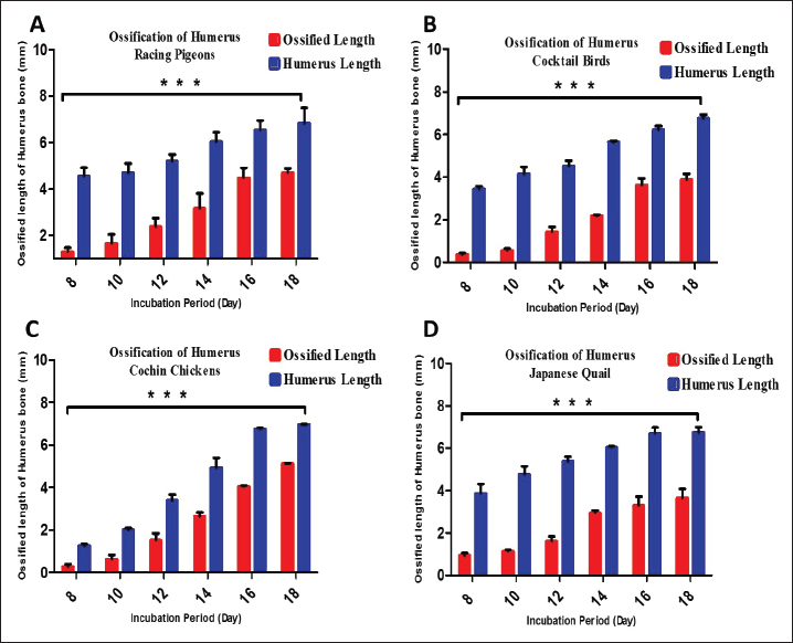 Fig. 1. Graphs showing the significant difference in the total length (blue color bars) and the length of the ossified part (red color bars) of the humerus for three embryos per day for 8, 10, 12, 14, 16, and 18 days of incubation of Rp (A), Cb (B), Cc (C), and Jq (D). The data are presented as (mean ± SE) at p ˂ 0.05. Microscopical resultsThe present study revealed that on day 8 of incubation, the cartilage template started to take on the shape of the potential humerus, complete with the middiaphysis and epiphyses at the end. The epiphyseal area was filled with tiny chondrocytes that were randomly dispersed throughout the extracellular matrix. These chondrocytes were observed in Rp, Jq, and Cb, which were observed in very few areas in Cc embryos. These chondrocytes ranged in size from round to oval. The hypertrophic zone, which was composed of large chondrocytes, was observed in the middle of the diaphysis, as well as on both of the hypertrophic zone’s boundaries. Additionally, the proliferative zone was composed of chondrocytes. The inner cellular layer of the perichondrium was differentiated into a few osteoblasts on the 8th day. In the middiaphysis region, where the chondrocytes had grown too large, these osteoblasts deposited osteoid tissue in the form of a bone collar on the 10th day. This caused the perichondrium to gradually transform into the periosteum (Fig. 5). The bone collar developed calcification on the 10th day. It was shown that in the mid-diaphysis region, where the chondrocytes had grown too large, the osteoblasts deposited osteoid tissue in the form of a bone collar, which caused the perichondrium to gradually transform into the periosteal. The results showed that osteoblasts started to form osteoid tissue using the cartilage matrix as a base. Bone spicules began to form at the beginning of endochondral ossification. Consequently, these spicules interconnected, resulting in the formation of bone trabeculae on day 12. On the 14th day, the periosteal bone collar had more osteoblasts depositing around the middiaphysis and thickening toward the center of the diaphysis. Mature osteoblasts become stuck in the matrix and change into osteocytes, leading to the formation of primary woven bone on day 14. Calcification of the trabecular bone transpired on the sixteenth day. The endochondral bone trabeculae were more fully developed when they encountered the periosteal bone collar. They were located throughout the middiaphysis of the humerus. Changes in the development of long bones in the limbs were observable as early as the 18th day of incubation. These alterations caused the diaphysis to expand in both length and width. During resorption, the osteoclasts dismantled the endochondral trabecular bone. This event initiated the formation of the bone marrow cavity in the middiaphysis on day 18.