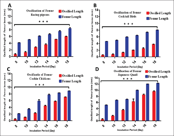 Fig. 2. Graphs showing the significant difference in the total length (blue color bars) and the length of the ossified part (red color bars) of the femur for three embryos per day for 8, 10, 12, 14, 16, and 18 days of incubation of Rp (A), Cb (B), Ccs (C), and Jq (D). The data are presented as (mean ± SE) at p ˂ 0.05.