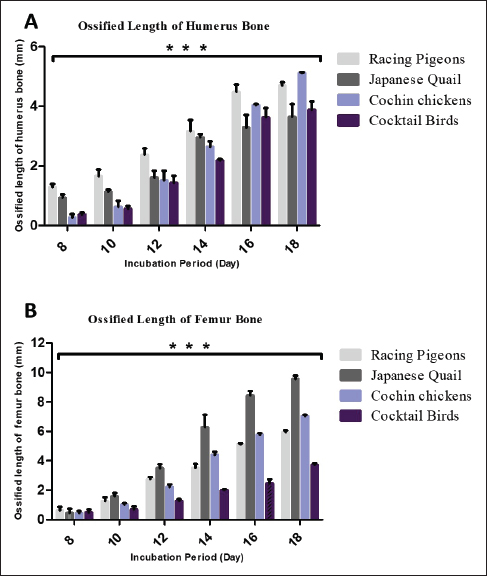 Fig. 3. Graphs showing the significant difference in the total length of the ossified part of the humerus (A) and femur (B) for three embryos per day for 8, 10, 12, 14, 16, and 18 days of incubation of Rps (light gray color bars), Jq (dark gray color bars), Ccs (blue color bars), and Cocktail birds (black color bars). The data are presented as (mean ± SE) at p ˂ 0.05. DiscussionAnatomical studyHL calcification affects standing and movement during embryonic development (Pourlis et al., 1998). However, the FL holds the body during flight. Skeletons are the main body support. This study, which examined the skeletogenesis of different bird embryos, suggests that early embryonic skeletogenesis events may vary within and between species (Li et al., 2024). The ground-dwelling Jq and Cc were compared in this study. Both birds require strong HL to walk, run, and fly. Nakamura et al. (2019) reported that the HL, like the Jq and Cc bones, ossifies faster. However, quail embryos developed faster and matured when hatched. Wu et al. (2022) reported that pigeons develop faster than quails after hatching. This study demonstrated cartilage ossification in the quail femurs and tibiofibular bones on day 8 and in the Cc bones on day 10. Zorab and Salih (2021) reported that HL ossified continuously and progressively during embryonic development, with most of them ossifying before hatching, consistent with earlier studies (Nakane and Tsudzuki, 1999; Dial and Carrier, 2012). Rp and Cb spend much of their time flying. Thus, their FL must develop to generate flying power. As shown in Figure 1, the order and duration of chondrification and ossification for most FL and HL bones in Cb, Jq, Rp, and Cc are given. The calcification patterns of the FL, such as the humorous bone and HL femur, showed variances in the skeletogenesis order of ossification. The embryonic bones of the Cb and Rp embryos showed calcification far later than those of humorous on Jq. However, Jq embryos form these bones, which are calcified later than normal bones. This calcification delay occurs between the terminal and first phalanges. Comparing a bird’s FL and HL on the bone morphology and embryonic skeleton staining showed that Jq and Rp had different embryonic development patterns and hatching skeletal development rates. Different skeletal development rates explain these disparities in precocial and altricial embryos (Wu et al., 2022). In contrast to other developmental features, the typical ossification sequence pattern is consistent. This is true even when FL and HL features evolve differently (Wu et al., 2022). This is also true for precocial and altricial birds (Wei and Zhang, 2019). These findings suggest that animal locomotion is linked to limb-bone mechanical performance (Gillian, 2000). Jq hatchlings have completely formed HL, according to Nakane and Tsudzuki (1999). Pigeons prefer to fly but can dig and feed on their back legs. This shows that the hatching Cc and Jq have different geometrical and mechanical femur bones than Rp and Cb. Wu et al. (2022) found stiff bone tissue in hatching quails. In reality, Jq, especially domesticated ones, are ground-dwellers, and their HL is essential for walking, running, and flying (Li et al., 2024).