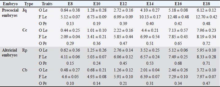 ABSTRACTBackground: Birds are the group of tetrapods that exhibit the greatest diversity in taxonomy and ecology. Limb development is a major focus of developmental and evolutionary biology research. Aim: This study characterized the variances in histomorphometry of skeletogenesis in precocial embryos, such as Japanese quail (Jq) and Cochin chickens (Cc), and altricial embryos, including Racing pigeons (Rp) and Cockatiel birds (Cb). Methods: Six embryos were collected on days 8, 10, 12, 14, 16, and 18 of incubation. Three embryos were prepared and stained with Alcian Blue for chondrification and Alizarin Red for ossified bones. The remaining three embryos were subjected to histological evaluation. Results: Initial signs of ossification appeared in the femur, tibiofibular, and humerus bones of Jq, Rp, and Cb embryos on day 8 and in the bones of Cc on day 10. The statistical study revealed that embryos of different developmental days had considerable variations in average ossified lengths for the humerus of the forelimb, especially Rp, and the femur of the hindlimb, notably in Jq. On day 8, microscopic examination revealed a hypertrophic area with enlarged chondrocytes in the middle and sides of the diaphysis. Osteoblasts significantly augmented the periosteal bone collar around the mid-diaphysis, enhancing its thickness toward the diaphysis center; by day 16, the primary woven bone had developed. Conclusion: This study highlighted the growth rate of the hind limb in precocial embryos, particularly in Jq, which was higher than that in other embryos. These data serve as essential indicators and indispensable parameters for interpreting and elucidating the data collected in these studies. Keywords: Avian embryo, Chondrification, Limb development, Osteogenesis, Skeletogenesis. IntroductionBirds modify the shapes of their limb bones to withstand the forces generated during movement (McGuire et al., 2020). Both developmental and evolutionary biology now consider the process of limb formation in vertebrates, with a significant focus on evolutionary biology on the transition from the fin to the limb (Sears et al., 2018; Watanabe, 2018). Birds are the group of tetrapods that exhibit the greatest diversity in taxonomy and ecology (Xu et al., 2014). The forelimbs (FL) have evolved into wings primarily for flight, while the legs serve as a mechanism for bipedal movement (Gillian, 2000; Watanabe, 2018). Some studies indicate that altricial birds are distinguished by the swift early maturation of “supply” organs, including digestive systems. Conversely, precocial birds have accelerated the early development of many “demand” tissues, including the muscular, nervous, skeletal, and feathers (Dial and Carrier, 2012; Augustine et al., 2019). The morphological process of embryonic development is responsible for the majority of skeletal features in the avian limb. Nevertheless, certain morphological alterations, such as fusion and distortion of the skeletal structure, occur during the latter stages of development or after hatching (Seki et al., 2012). Birds develop and increase the size of their bones through intramembranous and endochondral ossification (Nie et al., 2019). Endochondral ossification is the process by which mesenchyme cells convert into cartilage templates and then into bones. On the other hand, intramembranous ossification involves the direct conversion of mesenchyme cells into bone tissue (Ahmed and Soliman, 2013). Osteogenesis, also known as ossification, is a biological process involving the formation of new bone. Chondrogenesis is the initial stage of skeletal development. It occurs during embryonic development in the early phases of somitogenesis and leads to the formation of the first skeletal bones (Gao et al., 2018). Bone growth forms the body scaffold through a series of synchronous actions. During maturation, the bone and the surrounding environment, which includes Schwann, endothelial, and inflammatory cells, remain active throughout adulthood, facilitating the return of tissue to its homeostatic functioning condition (Salhotra et al., 2020). Appositional development occurs inside the periosteal plate, and interstitial cartilage growth in the epiphyseal plate is responsible for bone growth (Gao et al., 2018; Li et al., 2024). The developing embryo’s somatic mesoderm is responsible for producing the skeletal components of the limbs. The somatic mesoderm originates from a single layer of the lateral plate mesoderm during the ontogenetic development process. As a result, the celom divides into two distinct layers (Prummel et al., 2020). Although a substantial amount of information is available on these systems, the mechanism responsible for producing the distinct skeletal structure and arrangement of limbs in birds is still not well understood (Seki et al., 2012). During adulthood, bone remodeling is a regulated and balanced process involving osteoclasts, which break down bone, and osteoblasts, which build new bone. This process helps maintain bone homeostasis (Regatta and Artridge, 2010). During embryogenesis, osteoblasts release a matrix, some of which embeds inside newly created bone. Then, they change into osteocytes, which help bones grow through ossification that occurs inside or outside the membrane (Chan et al., 2021). Bone homeostasis is an intricate process in which osteoclasts break down bone and generate new bone tissue. Precise control and coordination of this process are crucial for preserving bone integrity (Al-Agele et al., 2021). Osteoclasts are large, multinucleated cells originating from hematopoietic cells in the bone marrow. They play crucial roles in preserving the equilibrium of the skeletal system and producing blood cells (Ikeda and Takeshita, 2016). Multiple intricate functional and evolutionary aspects impact the formation and development of bone, which is a very intricate structure. For birds, this involves the difficulty of adapting their skeleto