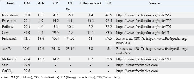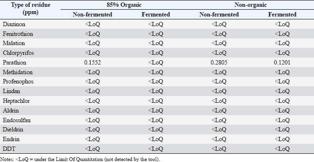 ABSTRACTBackground: The practice of feeding agricultural waste to animals, especially sheep, is common in Indonesia. The market demand for organic sheep meat has increased these days. However, the availability of organic feed is an obstacle to organic livestock farming, particularly in Indonesia, where agriculture depends heavily on chemical fertilizers and pesticides. Feed processing that reduces pesticide residue levels is a step as an alternative feed provider for beginner organic farmers. Aim: This research aims to analyze changes in nutritional quality, fiber fraction, digestibility, rumen environmental conditions, and pesticide residue levels in organic and inorganic rations with fermentation treatment. Methods: The research treatments were divided into organic and non-organic groups, and each group was then divided into fermented and non-fermented treatments. Fermentation was carried out using Starbio® for 21 days. All treatment feeds were prepared to meet the needs of sheep using the same composition formula. The ration consisted of rice straw, rice bran, pollard, corn, fish meal, Azolla, molasses, salt, and CaCO3. The research data were analyzed and presented in a quantitative descriptive manner. Results: The results showed that the non-fermented feeds exhibited higher nutritional quality, including the fiber profile and total volatile fatty acid, compared to fermented feeds. The fermentation process increases the digestibility and reduces pesticide residues, particularly parathion levels up to 0.15 ppm. Conclusion: This research concludes that the fermentation process increases digestibility and reduces pesticide residues in the ration for both organic and non-organic sources, but does not improve the overall nutritional value of the non-fermented feed. Keywords: Nutritional quality, Fiber fraction, Digestibility, Pesticide residue. IntroductionThe consumption of organic products trend is increasing worldwide and is likely to continue. Although global organic food sales have slowed since 2008, the market has increased over three-fold between 2000 and 2010 (Willer et al., 2024). In 2010, the countries with the largest organic markets were only the US, Germany, and France, but in 2023, they have spread into several countries such as Africa, Asia, Europe, Latin America, North America, and Oceania countries (Buder et al., 2014; Willer et al., 2024). These findings are due to consumer awareness of the correlation between health, nutrition, and natural environmental sustainability (Goetzke et al., 2014; Zhang et al., 2018). The fact that there are product-specific purchase barriers for organic food consumers. The willingness to buy and pay for organic products differs among consumers, depending on their life background, especially their financial capabilities (Sriwaranun et al., 2015; Aschemann–Witzel and Zielke, 2017). The high cost of organic products is due to the organic quality requirements that must be met. The main requirement for organic livestock farming is to ensure that the system implements environmentally friendly and animal welfare methods. Breeders must be committed to caring for animals in accordance with animal welfare principles. Specifically, using chemicals in fertilizers, medicines, additives, and feeds does not permit products to be labeled organic (The Indonesian National Standard: 6729, 2016; European Commission, 2021). This increases the cost of organic livestock products costlier, likely due to a lot of support on the production chain (Zikeli et al., 2014). Indonesia holds the opportunity to be a major supplier of organic livestock due to its abundant natural resources and agricultural waste, which are commonly used as ruminant feed sources. However, this is largely limited by the heavy use of chemical pesticides for pest control. Most Indonesian farmers (95.29%) choose chemical pesticides because they are easier to use, more effective, and cheaper than natural pesticides (Andesgur, 2019). Although the use of pesticides has been proven to reduce harvest losses of fruit production by 78%, vegetable production by 54%, and ceral production by 32% (Tudi et al., 2021), it also pose a threat to human and environmental health, including the reduction of biodiversity (Jamin et al., 2024), decrease of soil nutrient (Sinambela, 2024), increase of pesticide-resistant insects (Moekasan and Prabaningrum, 2021), and damage to human health via direct and indirect exposure (Shekhar et al., 2024). This research highlights the problem of feed availability to support organic livestock cultivation. Organic animal farming requires that the feed is composed of 100% organic ingredients or at least 85% dry matter (DM) sourced from organic forage. In some cases, when the source is limited, the policy states that feed for organic farming can be composed of limited use of non-organic ingredients, as long as it is not genetically modified. Animal-source ingredients, such as meat bone meal, should not contain pesticide residue. Organic animal feed also requires that minerals, provitamins, and vitamins are from natural sources. Additives may be used only from non-genetically modified organisms and non-genetically engineered products. Salt, yeast, enzymes, molasses, and other natural sources additives are permitted as per Indonesian National Standard regulation (2016). The aforementioned regulation also states that non-organic plants can be used only if they are produced using non-chemical solvents or treatments. A couple of studies reported that pesticide residues can be reduced by the fermentation process (Ge et al., 2021; Armenova et al., 2023). According to the aforementioned statements, this study aimed to examine the effect of feed fermentation on the nutritional content, digestibility, and pesticide residues of organic feed formulated for sheep compared with non-organic feed. Materials and MethodsStudy period and locationThis research was conducted from January to March 2024 in 