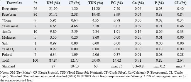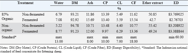 DiscussionThe data presented in Table 1 suggested that the treatment rations have met the standards for sheep rations; however, the ash content for all treatments was higher than the Indonesian standard (maximum of 8%), and CP content was lower than the Indonesian standard (minimum of 10%) for non-organic, fermented treatment Indonesian National Standardregulation (2019). The ash percentage correlated negatively with the OM content in the ration. Higher ash content in ruminant diets was suggested in the presence of higher fiber sources, such as hay, legumes, and forage (Hoffman, 2005). Ash content was also determined by the inorganic material that may have contaminated the feed, such as soil. Ogodo et al. (2017) also mentioned that fermentation significantly increased the ash content in maize flour. Ash content was positively correlated with mineral content in the feed, which was significant in ruminants, particularly for milk production. This statement was supported by Schären et al. (2016), who found that replacing total mixed ration feed with pasture resulted in positive changes in lactating cows, particularly after an adaptation period of 7 weeks in milk production and body weight. However, using full forage in livestock for fattening purposes was ineffective. Zhang et al. (2022) suggested that concentrated-intensive fed sheep showed heavier body weight, increased production performance, and improved meat color, texture, and fatty acid profile compared to full-forage fed sheep. This research combined high-nutrition ingredients, such as corn, rice bran, pollard, and so on, to fulfill the sheep’s nutrition. The slight difference in protein content in the non-organic, fermented treatment (9.97%) compared with the minimum standard of protein in sheep feed (10%) might be negligible. However, compared with the other treatments, this value was the lowest. The average CP content for organic (fermented and non-fermented) and non-organic-non-fermented treatments was 13.42%, with each treatment’s CP content as follows: organic non-fermented feed (13.39%), organic fermented feed (13.48%), and non-organic non-fermented feed (13.40%). Low CP content was also observed in rice straw fermented by StarBio for 14, 21, or 28 days, resulting in CP contents of 11.78%, 6.68%, and 7.61%, respectively (Akbar et al., 2022). The low protein content of non-organic fermented feed may be due to the fermentation process. The decrease in the CP content examined in this study was partly attributed to the metabolic process by microorganisms and enzymes on lipids and sugar (Alrosan et al., 2022). A similar value for CP content can be examined in the non-fermented and fermented feeds. Furthermore, optimization studies of fermentation conditions and sources may offer different outcomes. The varied protein compounds in organic and non-organic feed materials used in this research might contribute to the difference in the CP content results of the fermented products. However, this finding showed that organic-sourced feed did not reduce the protein content in the total ration of sheep, so the notion that organic-fed livestock received less nutritional content was likely untrue.