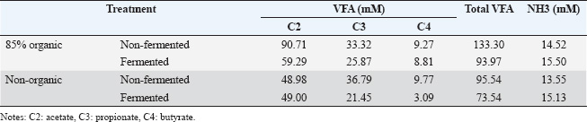 Cellulose and hemicellulose are the main parts of plant cell walls that can be degraded and fermented by anaerobic microbes in the rumen to produce VFA (Weimer, 2022). The higher values of both cellulose and hemicellulose in the fermented groups were attributed to the nature of the Starbio® composition of dried leaves and twigs. However, analysis of nutritional values alone could not be the determining factor of feed quality. Digestibility analysis should also be conducted to determine feed quality. The digestibility analysis of this research is presented in Figure 1. The DMD of fermented feed was higher than that of non-fermented feed in both groups: 64.20% on fermented organic feed versus 60.10% on non-fermented organic feed and 67.99% on fermented non-organic feed versus 63.07% on non-fermented non-organic feed. This trend was also examined on OMD. The availability of digestible material in fermented feeds was significantly increased. This could be caused by the destruction of crude fiber by microorganisms during the fermentation process. The nutrient content of the feed, particularly crude fiber, was metabolized by microorganisms in the fermenter before it even reached the rumen, so the ruminal microorganisms could digest the feed more easily, thus resulting in increased total digestibility in both DM and OM. The fermentation process in both the organic and non-organic feed groups exhibited reduced total VFA and increased NH3 levels in vitro. The VFA values indicated the amount of energy ready to be absorbed by the rumen. Aside from their function as the main energy source for ruminants, VFAs also affect gastrointestinal development, milk yield and composition, rumen microbiota, and body weight gain (Parchami et al., 2024). The total VFA value for the fermented feed was lower than the non-fermented feeds: 93.97 versus 133.30 on organic-sourced feed and 73.54 versus 95.54 on non-organic feed. This result agreed with Lee et al. (2023), which showed decreased VFA value of fermented concentrate in vivo. It was suggested that starbio® has metabolized some of the feed ingredients before they reached the rumen; thus, the total VFA examined is lower than those in the non-fermented groups. However, the total digestibility value of both DM and OM was higher in the fermented groups. This might be due to the digestion process by Starbio® and the ruminal microbiota; therefore, postrumen digestion contributed more to the total digestibility value. Intake of fermented concentrate improves microbial diversity within the rumen, thus enhancing microbial activity, which is crucial for digestion (Lee et al., 2023). Despite the varied VFA values of each treatment, the VFA values examined in this research were still within the normal range. It can, therefore, be concluded that supplementing non-organic material with organic material and fermenting the feed did not reduce the quality of the feed based on VFA values. The results observed in this research showed that the fermentation process increased the ammonia value of feed digested in the rumen. This suggests that the CP metabolized by the ruminal microbiota was higher in fermented than in non-fermented feeds. This result was similar to the results obtained by Lee et al. (2023), in which the ammonia level was higher by about 5 mg/dl in fermented concentrate feed compared to non-fermented concentrate examined in Hanwoo steers. However, the ammonia values examined in this research were still within the normal ammonia levels of 1–16 mM/l. The overview of the data obtained in this research suggests that the values differed in digestibility, even if the proximate analysis showed high nutritional value (on non-fermented organic and non-organic feeds). The determination of a good complex feed relied not only on the proximate analysis evaluation but also on its digestibility value. The total VFA values for all treatments were considered normal in the 80–160 mMol range (Van Soest, 1982), except for the fermented non-organic feed, which was lower than normal (73.54 mMol). This finding may be beneficial for adding to the discussion of the quality of ruminant feed. Higher digestibility values accompanied by lower total VFA levels obtained in this study were considered better options for ruminant feed than higher total VFA numbers but lower digestibility values. According to the assumptions above, the non-organic, non-fermented feed was considered the best nutritious feed for ruminants among other treatments. This particular treatment had the lowest water and ash contents, each valued at 5.22% and 10.71%, respectively. This suggested that the non-organic, non-fermented feed contained more OM that could be used by ruminants in their diet. Besides its nutritional content, the VFA ratio of non-organic, non-fermented feed was considered the best for fattening sheep among the other treatments. Acetate (C2) was associated with milk fat production, and butyrate increased trans-10 C18:1 concentration in milk, indicating a shift in the rumen biohydrogenation pathway. Furthermore, acetic acid is generally used as an energy source and is nonglucogenic in animal tissues. Propionic acid is the main precursor for the formation of blood glucose, and it is a glucogenic (Vlaeminck et al., 2006). A high acetate-to-butyrate-to-propionate ratio indicated that the feed was more suitable for dairy ruminants, whereas a lower ratio of feed was considered more suitable for fattening ruminants (Widianingrum and Salasia, 2019). According to the VFA data alone, the non-organic, non-fermented feed was suggested for the fattening period, whereas the organic and fermented feed was suggested for the lactating period. The fermentation process carried out in this research did not provide improvement in nutritional value, but increased digestibility and reduced pesticide residue levels (Table 6). The <LoQ results in the table indicated that the result was not detected on the GC device (the limi