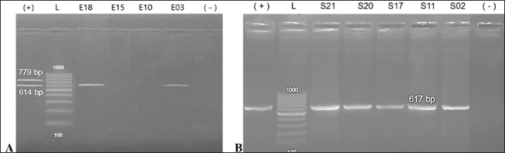 Fig. 1. Electrophoresis results of multiplex PCR products for virulence genes. (A) E. coli: positive for the Stx1 gene (614 bp) in lanes E03 and E18. (B) Salmonella: positive for the Stn gene (617 bp) in lanes S02, S11, S17, S20, and S21. *Statistically significant differences (P < 0.05). Table 3. Identification of toxigenic bacterial strains using 16S rRNA gene sequencing.