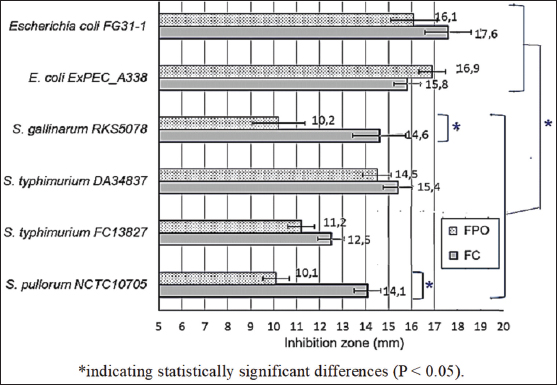 Fig. 3. Inhibitory effects of FPO and FC on pathogenic bacteria. Table 5. MIC (mg/ml) and MBC (mg/ml) of FPO and FC against pathogenic bacteria.