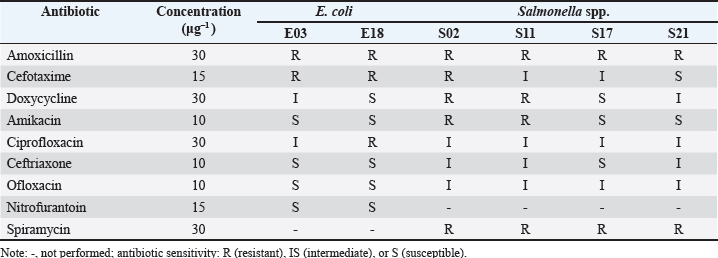 The antibiotic resistance status of pathogenic bacteriaThe E. coli and Salmonella isolates exhibited multidrug resistance (MDR), particularly for beta-lactam antibiotics (amoxicillin and cefotaxime) and macrolide antibiotics (spiramycin). However, various antibiotic resistance strains were recorded for both species. Escherichia coli isolates generally showed greater sensitivity to amikacin and nitrofurantoin than Salmonella spp. (Table 4).