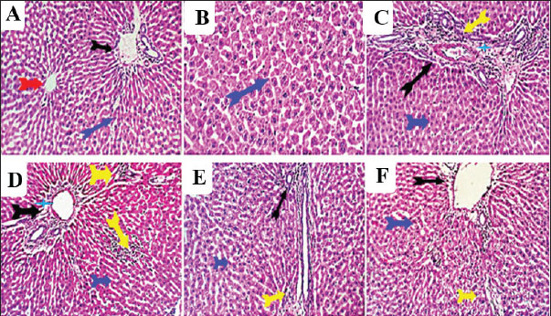 Fig. 7. Photomicrograph of liver sections for histopathological changes: control (A), vit C (B), 1/10 THM LD50 (C), 1/20 THM LD50 (D), 1/10 THM LD50 + vit C (E), and 1/20 THM LD50 + vit C (F). Kidney sections (Fig. 8) of the control and vit C groups revealed normal histomorphology of nephron units, collecting tubules, papillae, and renal pelvis with preserved glomerular tufts lobulation and endothelium, renal vascular structures, and epithelial lining of proximal and distal tubules. Kidney sections from rats orally administered with 1/10 and 1/20 THM LD50 showed moderate nephron-toxic lesions, renal tubular epithelial degenerative changes involving the proximal and distal convoluted tubules, tubular dilatation with hyaline cast formation, particularly affecting the collecting tubules, glomerular lobulation and/or shrinkage, and moderate to marked perivascular edema associated with lymphocytic infiltration. Occasional focal hydronephrotic changes, lymphocytic papillitis, and pyelitis were observed. Kidney sections from rats treated with 1/10 and 1/20 of THM LD50 and co-administered with vit C revealed residual degenerative and ectatic changes in the tubular epithelium in addition to mild perivascular edema and glomerular tuft lobulation.