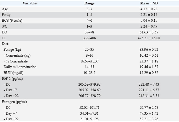 Open Vet. J.. 2025; 15(7): 2982-2992 Open Veterinary Journal, (2025), Vol. 15(7): 2982-2992 Research Article Effects of concentrate intake on blood urea nitrogen, estrogen, and IGF-1 levels in relation to pregnancy status and milk yield in smallholder dairy cowsSuzanita Utama1, Fachruddin Aziz2, Syaiful Rizal3, Sri Mulyati1, Imam Mustofa1*, Aswin Rafif Khairullah4, Tita Damayanti Lestari1, Riza Zainuddin Ahmad4, Latifah Latifah5, Adeyinka Oye Akintunde6, Lili Anggraini5, Ertika Fitri Lisnanti7, Chairdin Dwi Nugraha5 and Arif Nur Muhammad Ansori8,9,101Division of Veterinary Reproduction, Faculty of Veterinary Medicine, Universitas Airlangga, Surabaya, Indonesia 2Master Program of Reproductive Biology, Faculty of Veterinary Medicine, Universitas Airlangga, Surabaya, Indonesia 3Research Center for Applied Zoology, National Research and Innovation Agency (BRIN), Bogor, Indonesia 4Research Center for Veterinary Science, National Research and Innovation Agency (BRIN), Bogor, Indonesia 5Research Center for Animal Husbandry, National Research and Innovation Agency (BRIN), Bogor, Indonesia 6Department of Agriculture and Industrial Technology, Babcock University, Ilishan Remo, Nigeria 7Program of Animal Husbandry, Faculty of Agriculture, Universitas Islam Kadiri, Kediri, Indonesia 8Postgraduate School, Universitas Airlangga, Surabaya, Indonesia 9Uttaranchal Institute of Pharmaceutical Sciences, Uttaranchal University, Dehradun, India 10Medical Biotechnology Research Group, Virtual Research Center for Bioinformatics and Biotechnology, Surabaya, Indonesia *Corresponding Author: Imam Mustofa. Division of Veterinary Reproduction, Faculty of Veterinary Medicine, Universitas Airlangga, Surabaya, Indonesia. Email: imam.mustofa [at] fkh.unair.ac.id Submitted: 07/02/2025 Revised: 15/06/2025 Accepted: 19/06/2025 Published: 31/07/2025 © 2025 Open Veterinary Journal