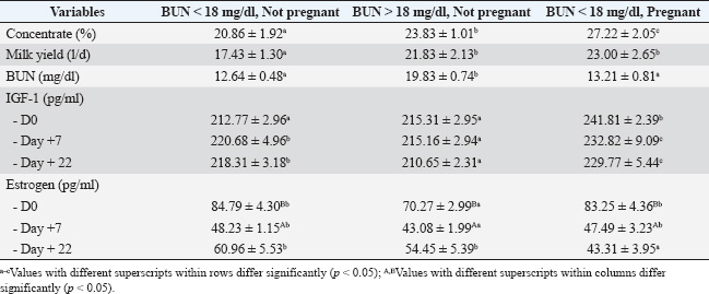 ABSTRACTBackground: Smallholder dairy farming is the largest fresh milk producer in Indonesia. The success of dairy cattle production depends on feed protein, increased blood or milk urea, increased crude feed protein, and increased degradation of feed protein. Aim: This study aimed to determine the effect of concentrate intake given to Friesian Holstein dairy cows on community farms on blood urea nitrogen (BUN), estrogen, and insulin-like growth factor-1 (IGF-1) levels. Methods: Gradually selecting the sample from 100, 50, and 21 dairy cows, we used the equality of variables as the control variable. Blood sampling was performed simultaneously on the day of artificial insemination (D0), the seventh (D+7), and D+22 (D+22) after artificial insemination. Pregnancy examination was performed using the rectal palpation technique three months after insemination. Results: Milk production and BUN levels increased with increasing concentrate intake up to a certain limit. Estrogen levels based on BUN and pregnancy on D0 and D+7 were not significantly different (p > 0.05) between the groups. In contrast to the group of nonpregnant cows with low BUN, estrogen concentrations in pregnant cows with low BUN and nonpregnant cows with high BUN were lower on D+22. IGF-1 levels in pregnant cows were higher for D0, D+7, and D+22 at unbalanced IGF-1 levels in cows with BUN >18 or <18 mg/dl. Conclusion: This research is an effort to increase milk production by increasing concentrate intake and must pay attention to BUN level, which affects up level of IGF-1, services per conception, and calving interval levels. Keywords: BUN, Estrogen, IGF-1, Milk yield, Pregnancy. IntroductionThe small holders dairy farming is the largest fresh milk producer in Indonesia. It is recommended that dairy cows get pregnant 2–3 months after calving in order to sustain high milk output (Mense et al., 2018). A key element of the extremely effective reproduction strategies of mammalian species is lactation. The role of feed is critical in dairy cows because it is a supporting source for the increased appearance of milk production and reproduction (Leduc et al., 2021). The addition of feed quality with a balanced ratio of forage and concentrate will provide good production and milk fat content. In this case, the formulation of dairy rations with a number of available feed ingredients is a very vital aspect, especially in order to balance the energy content and protein of the feed, of course without understating the role of other nutrients (Pesti and Choct, 2023). Pregnancy rates increased with higher intakes of soluble and fermentable neutral detergent fiber, whereas this measure decreased with higher milk output. Surprisingly, the percentage of pregnant women was positively correlated with the anticipated energy costs of urea generation (Rodney et al., 2015). Dairy cow fertility has decreased over the past 50 years as milk production per cow has increased in tandem with crude protein intake (Walsh et al., 2011). Cows that received more concentrate overall had greater energy and total dry matter intakes, which led to better milk output, lower body condition score loss, and negative energy balance (NEBAL) (Lawrence et al., 2015). A decrease in lactating cow fertility has been linked to increased milk production capacity (Butler, 2000). Reproduction depends on dietary proteins, and raised blood or milk urea, increased crude dietary proteins, and increased dietary protein degradability. Numerous studies have linked it to lower rates of conception and pregnancy. Blood urea nitrogen (BUN) or milk urea nitrogen (MUN) is a helpful metric for assessing the environmental effect and appropriateness of diets from dairy farms (Jonker and Kohn, 2001). Dairy cows that consume large amounts of rumen-degradable protein on a daily basis produce more milk, and they also have higher BUN concentrations (Rukkwamsuk, 2011). MUN is a useful and trustworthy signal for protein metabolism in dairy cattle, and it might be used in place of BUN as a urea status indicator in the field. Protein supply and fertility variations across herds have been predicted using urea nitrogen concentrations in bulk tank milk (Zhao et al., 2025). Reduced reproductive effectiveness has been linked to high BUN concentrations, which may be caused by changes in the intrauterine environment, including estrogen and insulin-like growth factor-1 (IGF-1) (Desta, 2024). Based on the physiology of cows, failed pregnancy could be caused by failure of oocyte maturation during folliculogenesis, fertilization, or implantation. High blood or milk urea levels were linked to conception or pregnancy (Raboisson et al., 2017). According to Utama et al. (2018), MUN, milk production, and reproductive performance were all higher in animals with a concentrate to forage ratio of greater than 30% than those with a lesser. In contrast, Putri et al. (2018) found that high concentration induced height BUN, in which BUN levels of more than 18 mg/dl failed cow to be pregnant. Hormone and other constituents are transported in blood plasma through the secretion of Mammary glands detected in milk and, of course, in the liquor of follicles (Mourupoju and Sundaresan, 2018). Several hormones, including IGF-1 and estrogen, are involved in follicle formation in the ovaries. The aim of this study was to determine the effect of concentrate intake given to Friesian Holstein dairy cows on community farms on BUN, estrogen, and IGF-1 levels. Materials and MethodsSpecifications of the cowsSmallholder dairy farms in Jambuwer Village, Malang District, East Java, Indonesia, have a total population of ±1,000 lactating dairy cows. Out of them, 100 cows were selected randomly based on criteria: not pregnant, lactation, parity more than one, milk yield, age, parity, health condition, and measured Body Condition Score (BCS) (1–9 scale). Parity is determined by the number of times a cow has given birth based on the inseminator’s r