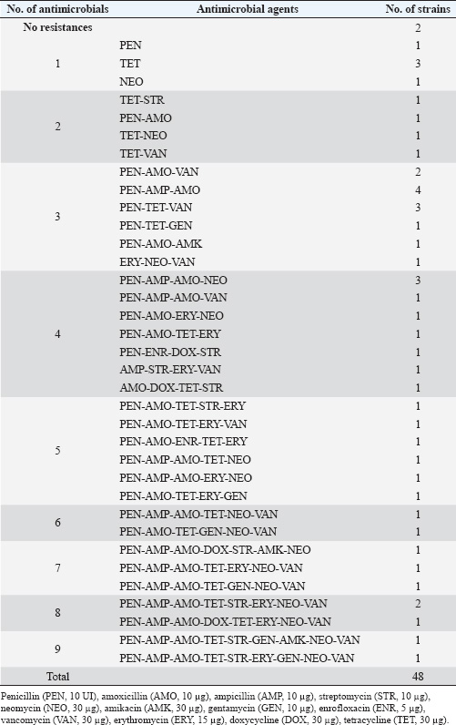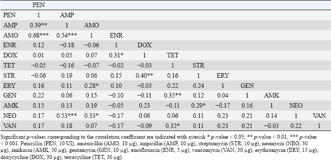 AMR profiles of S. aureus isolatesThe frequencies of resistance to 12 AM agents in six different groups were assessed. The results are summarized in Tables 3, 4, and 5. As shown in Table 3, the S. aureus isolates exhibited the highest rate of resistance to PEN (36/48, 75.00%), followed by AMO (31/48, 64.58%), and TET (26/48, 54.16%). The majority of the isolates were sensitive to AMK (45/48, 93,75%), followed by GEN and ENR (39/48, 81,25%), DOX (32/48, 66.67%), NEO (29/48, 60,42%), and AMP (24/48, 50.00%). Overall, 95.8% (46/48) of the S. aureus isolates were resistant to at least one AM (Table 5). The MARI values of the S. aureus isolates ranged from 0.17 to 0.75 (Table 5). There were 41 (85.4%) isolates resistant to two or more AMs (considered as multi-AMR), and most of the S. aureus isolates (27, 56.3%) resistant to three to five AMs (MARIs were 0.25, 0.33, and 0.42, respectively). The predominant MARI (0.17) was found in four isolates that were resistant to two out of the 12 AMs. Surprisingly, two S. aureus isolates were found to have the highest MARI of 0.75. They were resistant to 9 of the 12 AMs. A total of 32 MDR patterns were observed for the S. aureus strains for the 12 AMs tested (Table 4). Resistant to PEN-AMP-AMO was most prevalence observed in 4 (9.7%) MDR isolates. The other common patterns were PEN-TET-VAN-resistant and PEN-AMP-AMO-NEO observed in 3 (7.3%) MDR isolates. Prevalence of ARGs in the S. aureus isolatesThe ARG profiles of 48 S. aureus isolates from retail pork samples from Hue City are presented in Table 6. The most common in ARGs in the S. aureus isolates were tetM (30/48, 62.5%), blaZ (25/48, 52.1%), and femA (20/48, 41.7%). The incidences of rpoB (15/48, 31.3%) and ermB (12/48, 25.0%) were lower than those of other detected ARGs. The S. aureus isolates had multi-ARGs (35/48, 72.9%). Specifically, one isolate carried all five ARGs tested (Table 6). Correlations between the two AMR statuses of S. aureusThe pairwise correlation analysis of the AMR status of S. aureus isolates is presented in Table 7. Table 7 shows that several strong correlations among resistance to different AMs in S. aureus isolates were observed. A significant positive correlation was observed among the cell wall synthesis inhibitors, specifically between resistance to PEN and AMP, PEN and AMO, and AMP and AMO, with Pearson’s correlation coefficients of 0.39, 0.68, and 0.54, respectively (p < 0.001). Moreover, resistance to cell wall synthesis inhibitors was positively correlated with resistance to protein synthesis inhibitors, such as the resistance to AMP and NEO (0.53, p < 0.001), AMO and ERY (0.28, p < 0.05), and AMO and NEO (0.33, p < 0.05). For AMs that inhibit protein synthesis, resistance to STR, GEN, and AMK was positively correlated with resistance to DOX (0.40, p < 0.01), TET (0.35, p <0.01), and STR (0.29, p < 0.05), respectively. Table 3. Antimicrobial resistance prevalence among the S. aureus isolates.