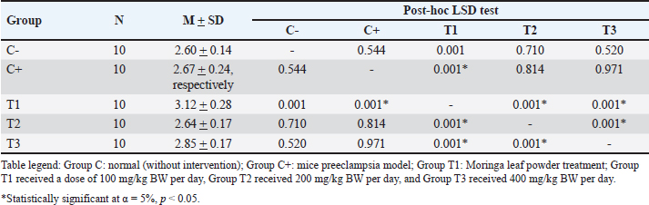 C-Reactive ProteinC-reactive protein is an acute-phase reactant protein produced by the liver in response to inflammation and is often associated with infections and chronic diseases. The level of ILs serves as an indicator of inflammatory processes that affect overall health (Nehring et al., 2023). Anti-Qa2 exposure elevates CRP levels, with the highest levels recorded in the T1 treatment group (3.12 ± 0.28). Moringa oleifera supplementation significantly reduced these levels, with the lowest CRP concentrations observed in the T3 treatment group (2.64 ± 0.17, p < 0.05) (Hikmah et al., 2019). This study’s findings are consistent with earlier research conducted by Hikmah et al. (2019) thereby substantiating the notion that in instances of preeclampsia, placental hypoxia conditions serve as a catalyst for an augmentation in CRP levels. CRP, in turn, has been identified as a pivotal instigator of the inflammatory response characteristic of preeclampsia. The study results further demonstrate that Moringa leaves have the capacity to attenuate CRP levels in the context of inflammation. Conversely, a study by Nuruhudin et al. (2020) found that M. oleifera leaf extract did not significantly lower high-sensitivity C-reactive protein levels in patients with systemic lupus erythematosus, despite a notable reduction in the MEX SLEDAI score (Nurudhin, 2020). AlbuminuriaUrinary protein levels serve as a clinical marker of endothelial dysfunction, a key factor in the development of preeclampsia. Exposure to anti-Qa2 increased albuminuria, with the highest levels observed in the C+ treatment group (8.00 ± 0.79) (Sakowicz, 2022). Moringa oleifera supplementation significantly reduced albuminuria caused by anti-Qa2 exposure, with the lowest levels found in the T2 treatment group (3.42 ± 1.09, p < 0.05) Sulistyowati (2025). Similarly, Akinrinde et al. (2024) reported that M. oleifera effectively mitigated oxidative stress by reducing MDA, protein carbonyls, and advanced oxidation protein products, while also lowering serum blood urea nitrogen and creatinine levels (Lingam, 2024). The present study demonstrated a substantial reduction in albuminuria levels in mice subjected to a preeclampsia model as a consequence of Moringa leaf administration. This finding aligns with the conclusions of several previous studies. Moringa has antioxidant properties that facilitate the repair of endothelial damage to the glomerulus, resulting in reduced albuminuria levels. A key limitation of the present study was the absence of a rigorous examination of kidney histology to ascertain any enhancements in kidney function. This investigation focused solely on albuminuria levels as a marker of ameliorating preeclampsia. ConclusionThe findings of this study indicate that the ethanol extract of M. oleifera leaves exerts a therapeutic effect against preeclampsia-associated symptoms. It is anticipated that this will emerge as a novel therapeutic option for this condition, with the potential to reduce maternal and fetal morbidity and mortality. The therapeutic effect of the administration of M. oleifera ethanol extract to mice model preeclampsia was demonstrated by a decrease in MDA and CRP levels in blood serum and albuminuria. AcknowledgmentsThe authors extend their sincere gratitude to the Embryology Laboratory, Faculty of Veterinary Medicine, Universitas Airlangga, for their invaluable support during this research. Conflict of interestThe authors declare no conflicts of interest related to this study. FundingThis research received no specific grant. Author’s contributionNutria Widya Purna Anggraini provided the contribution of all authors at submission, designed the analysis, performed the analysis, contributed data, and wrote the paper. Sri Sulistyowati conceived and designed the analysis, Soetrisno designed the analysis, Bambang Purwanto designed the analysis, and Paramasari Dirgahayu performed the analysis. Data availabilityAll data supporting the findings of this study are available in the manuscript. ReferencesAhmad, S., Pandey, A.R., Rai, A.K., Singh, S.P., Kumar, P. and Singh, S. 2023. Moringa oleifera inhibits protein glycation and exerts renoprotective effects in streptozotocin-induced diabetic rats. J. Ethnopharmacol. 305, 116–117. Akpan, H.B., Akande, A.A., Ojewale, A.O., Oladipupo, F.E., Akinpelu, O.F. and Jimoh, S.O. 2018. Moringa oleifera ameliorates nephropathic changes in alloxan-induced diabetic adult wistar rats. Afr. J. Health Sci. 6, 110–118. Batmomolin, A., Ahsan, A., Wiyasa, I.W.A. and Santoso, S. 2020. Ethanolic extract of Moringa oleifera leaves improve inflammation, angiogenesis, and blood pressure in rat model of preeclampsia. J. Appl. Pharm. Sci. 8, 52–57. García-Montero, C., Fraile-Martinez, O., De Leon-Oliva, D., Boaru, D.L., Garcia-Puente, L.M. and De Leãn- Luis, J.A. 2023. Exploring the role of Mediterranean- and Westernized diets and their main nutrients in the modulation of oxidative stress in the placenta: a narrative review. Antioxidants. 11, 1918. Hikmah, E.M.T., Liben, P. and Widjiati. 2019. Anti-Qa2 animal models for preeclampsia preclinical studies: a pathological elevation of blood pressure and proteinuria. Folia Biol. (Poland). 2, 69–78. Hahn, A.B., Tian, H., Wiegand, G. and Soloski, M.J. 2025. Signals delivered via the Qa-2 molecule can synergize with limiting anti-CD3-induced signals to induce T lymphocyte activation. Immunol Investig. 21(3), 203–217. Available via https://pubmed.ncbi.nlm.nih.gov/1350269/ (Accessed 4 February 2025). Herman-Lara, E., Rodríguez-Miranda, J., ãvila-Manrique, S., Dorado-Lãpez, C. and Villalva, M., Jaime, L. 2024. In vitro antioxidant, anti-inflammatory activity and bioaccessibility of ethanolic extracts from Mexican Moringa oleifera leaf. Foods. 13, 2709. Lingam, Y. 2024. A review of role of Moringa oleifera in kidney protection. Int. J. Herb. 12, 29–284 33. Li, Q., Yin, L., Si, Y., Zhang, C., Meng, Y. and Yang West. 2020. Bioflavonoi