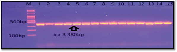 Fig. 7. Gel electrophoresis of icaB amplicon of S. aureus on (1%) agarose at 100 volt for 1 hour/M: DNA Marker 2,000 bp/ show the positive results for this gene with amplicon size 380 bp.