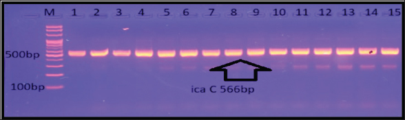 Fig. 8. Gel electrophoresis of the icaC amplicon of S. aureus on (1%) agarose at 100 volt for 1 hour/M: DNA Marker 2,000 bp/show the positive results for this gene with amplicon size 566 bp.